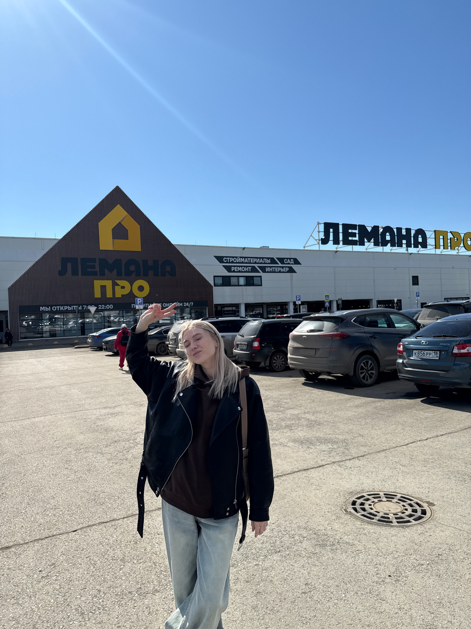 A woman is standing in front of a building materials store called "Лемана ПРО" in Izhevsk, Russia. She is wearing a black jacket, brown shirt, and light blue jeans. She is holding up two fingers in a…read more