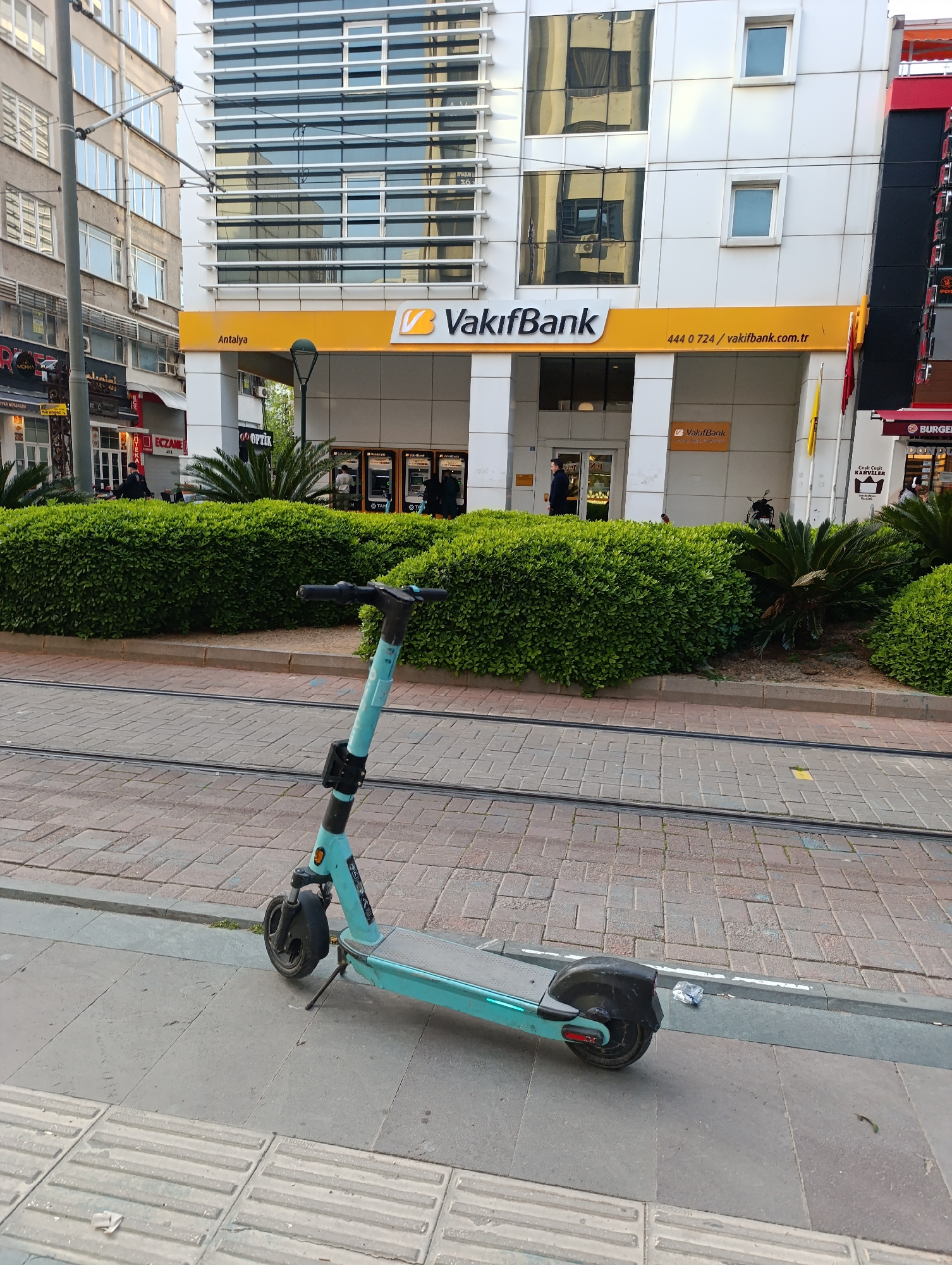 The scene depicts a light-blue shared electric scooter parked on a pedestrian sidewalk in Antalya, Turkey. The scooter is positioned in front of a VakıfBank branch, identified by its yellow signage. T…read more