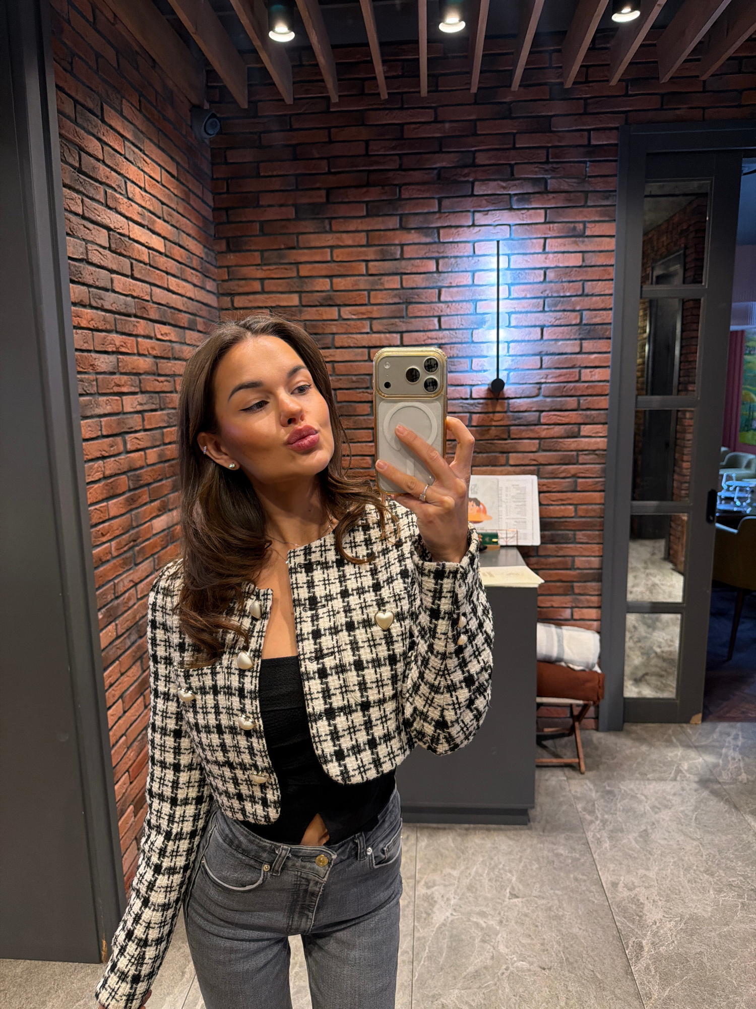 A woman with brown hair, wearing a black and white patterned jacket with pearl buttons and grey jeans, is taking a selfie with an iPhone. She has a light complexion and is making a kissing face. The b…read more
