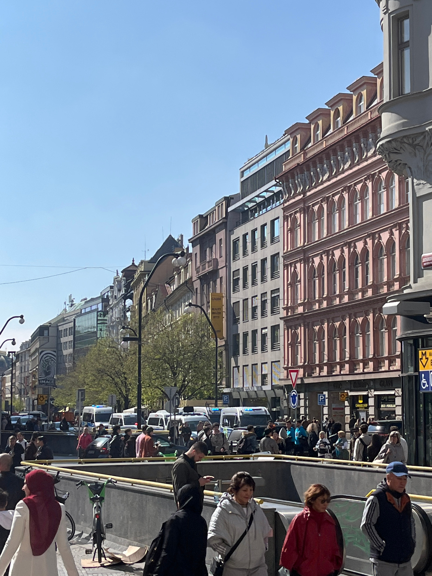 The image depicts a street scene in Prague, Czechia. The photograph is taken from a low angle looking up a bustling street. Buildings of varying heights line the street, exhibiting diverse architectu…read more