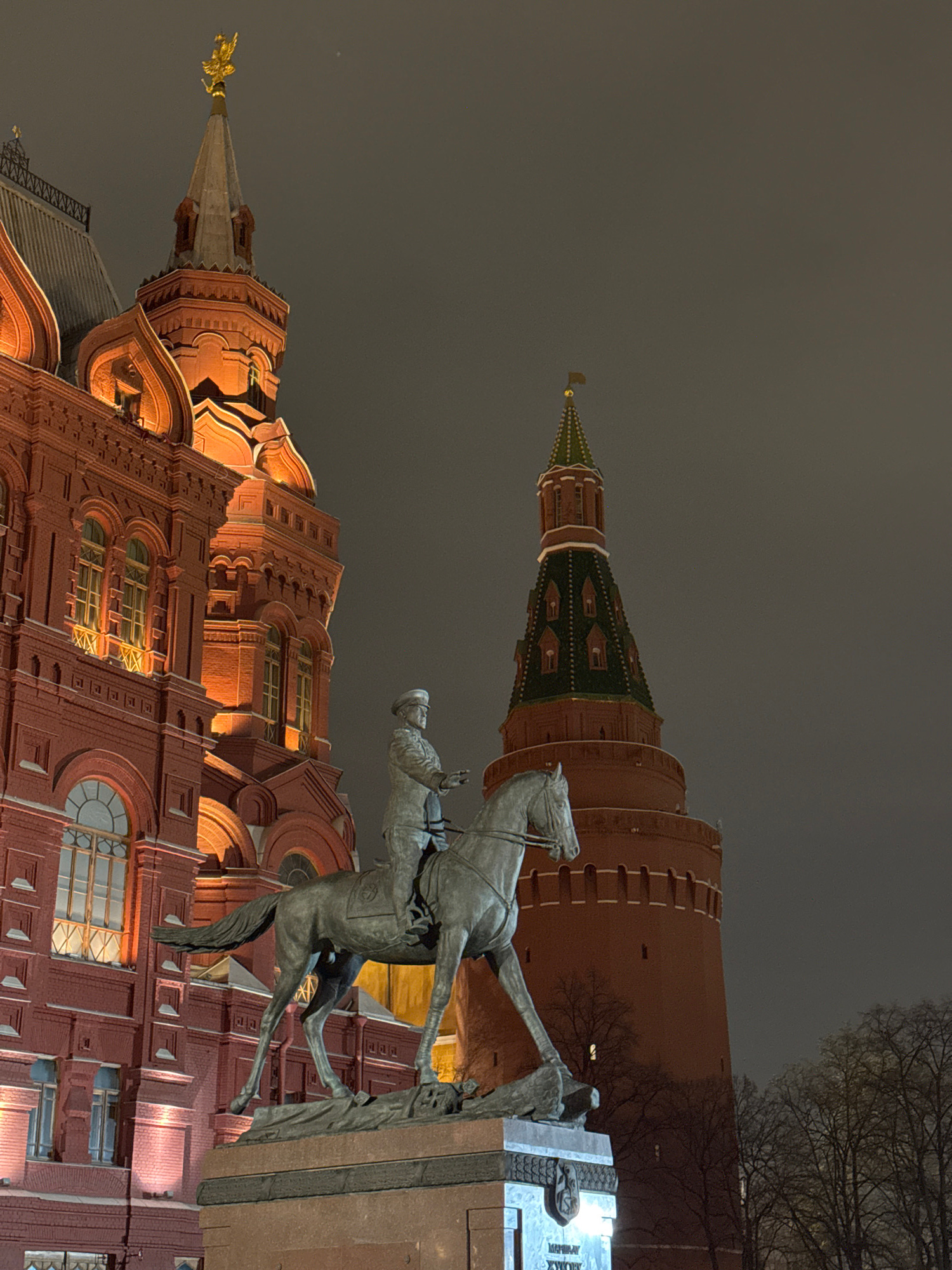 The image shows a night scene in Moscow, Russia. A statue of a man on horseback stands in front of the State Historical Museum and the Kremlin wall. The buildings are illuminated. The sky is overcast.