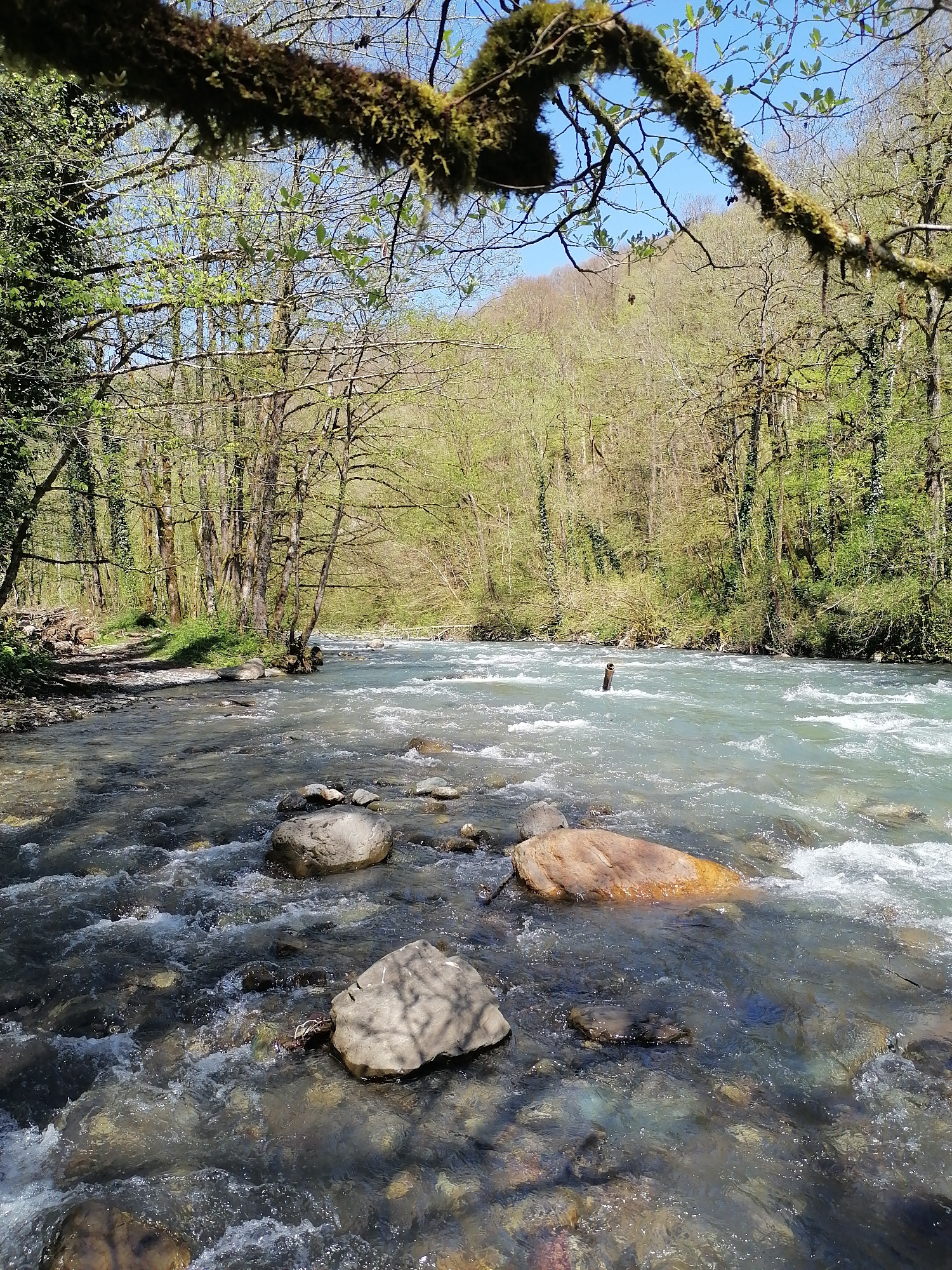 A vibrant natural landscape depicts a clear, swift-flowing river winding through a lush, deciduous forest, likely in early spring. In the immediate foreground, a thick, gnarled branch heavily draped w…read more