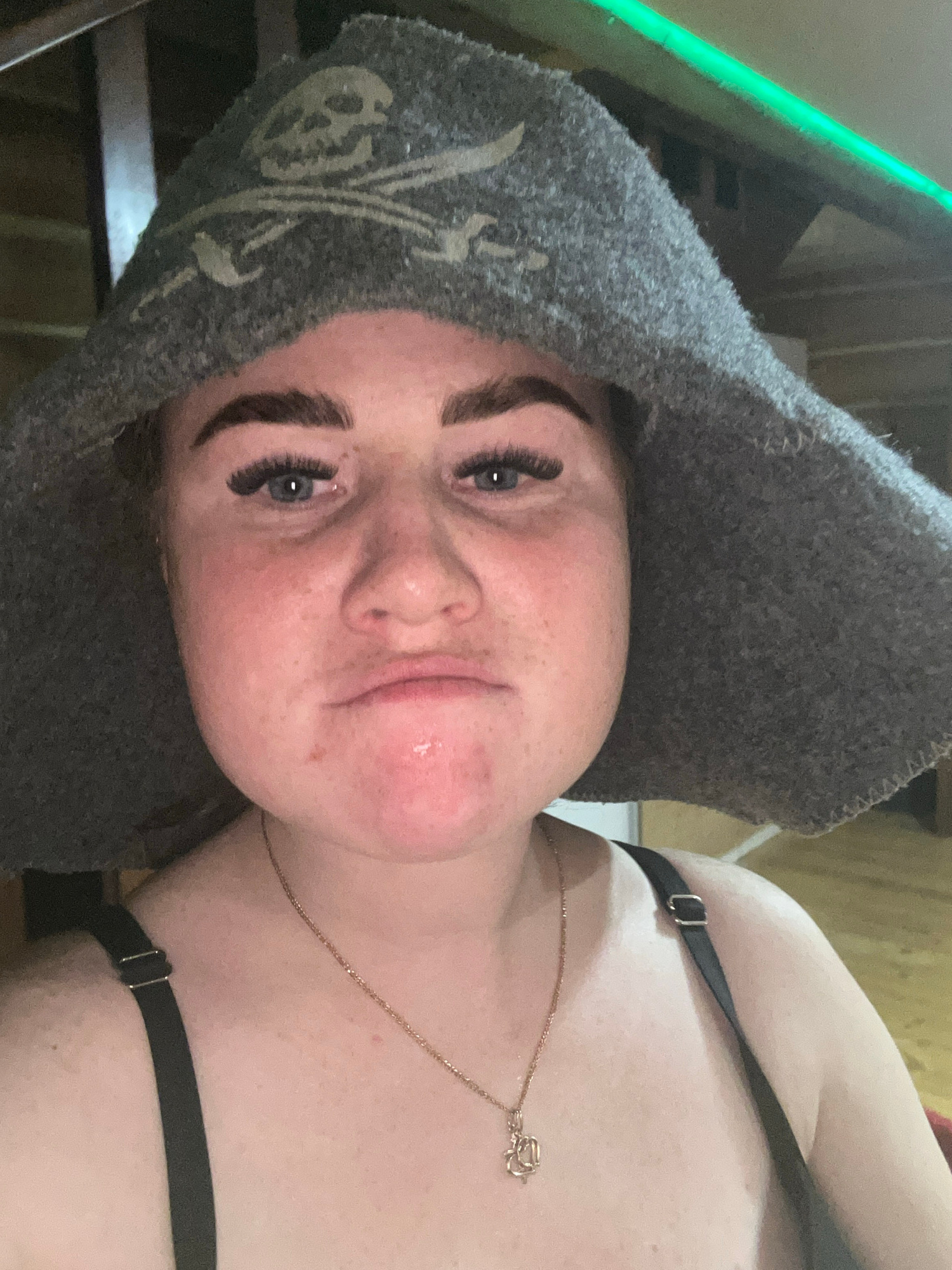 A close-up, rotated image shows a person wearing a gray pirate hat adorned with a skull and crossbones design. The individual has fair skin, visible freckles, dark, prominent eyebrows, and long eyelas…read more