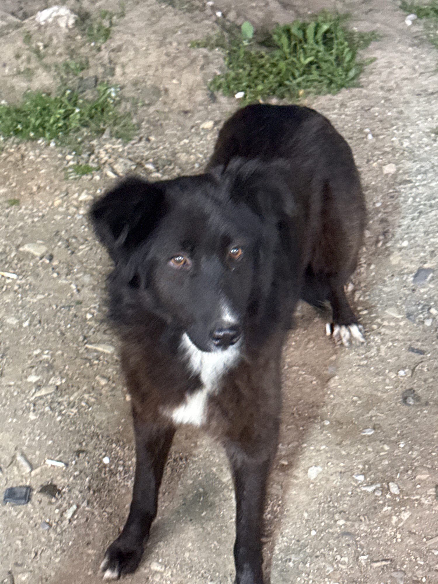 A black dog with a white patch on its chest lies on a concrete surface, interspersed with small stones and patches of green vegetation. The location is Sliven, Bulgaria. The dog is looking upward towaβ¦read more