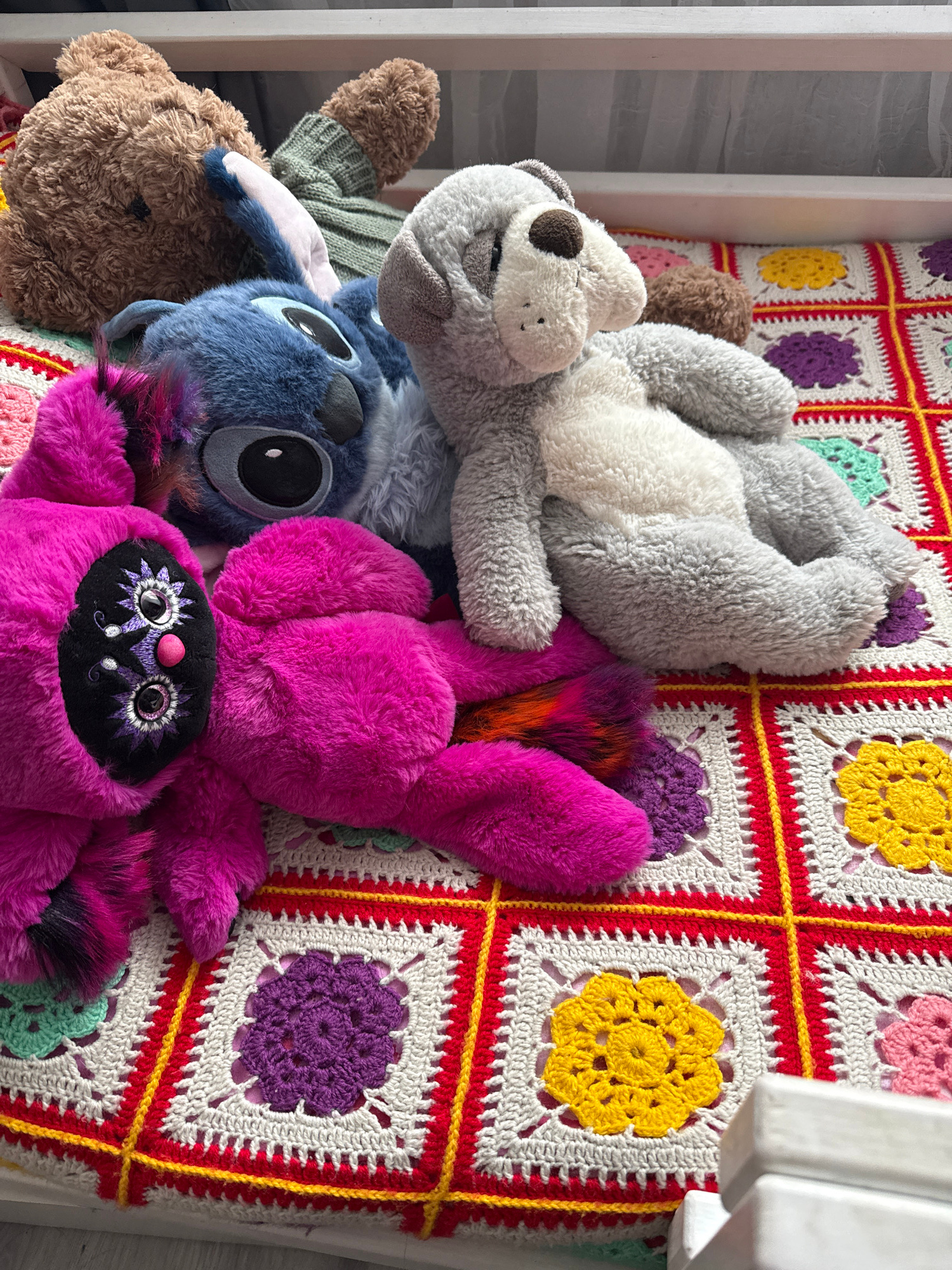 The image shows a collection of plush toys resting on a multi-colored crochet blanket with a square pattern featuring various colors, likely inside a baby's crib. The toys include: * A gray and white…read more