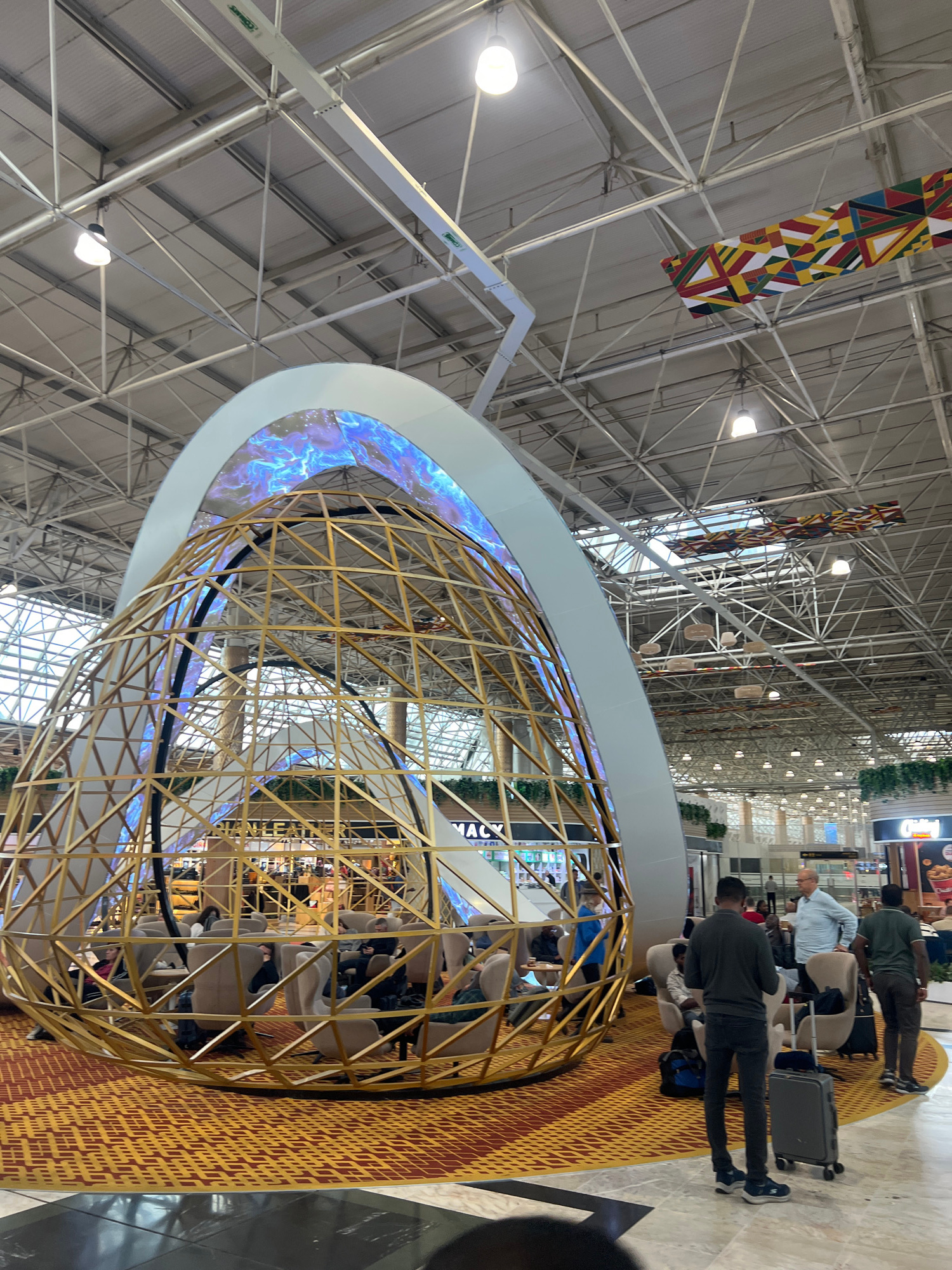 The image shows the departure hall of Bole International Airport in Addis Ababa, Ethiopia. The high ceiling is characterized by exposed metal framework and colorful fabric banners. A large, ornate, go…read more