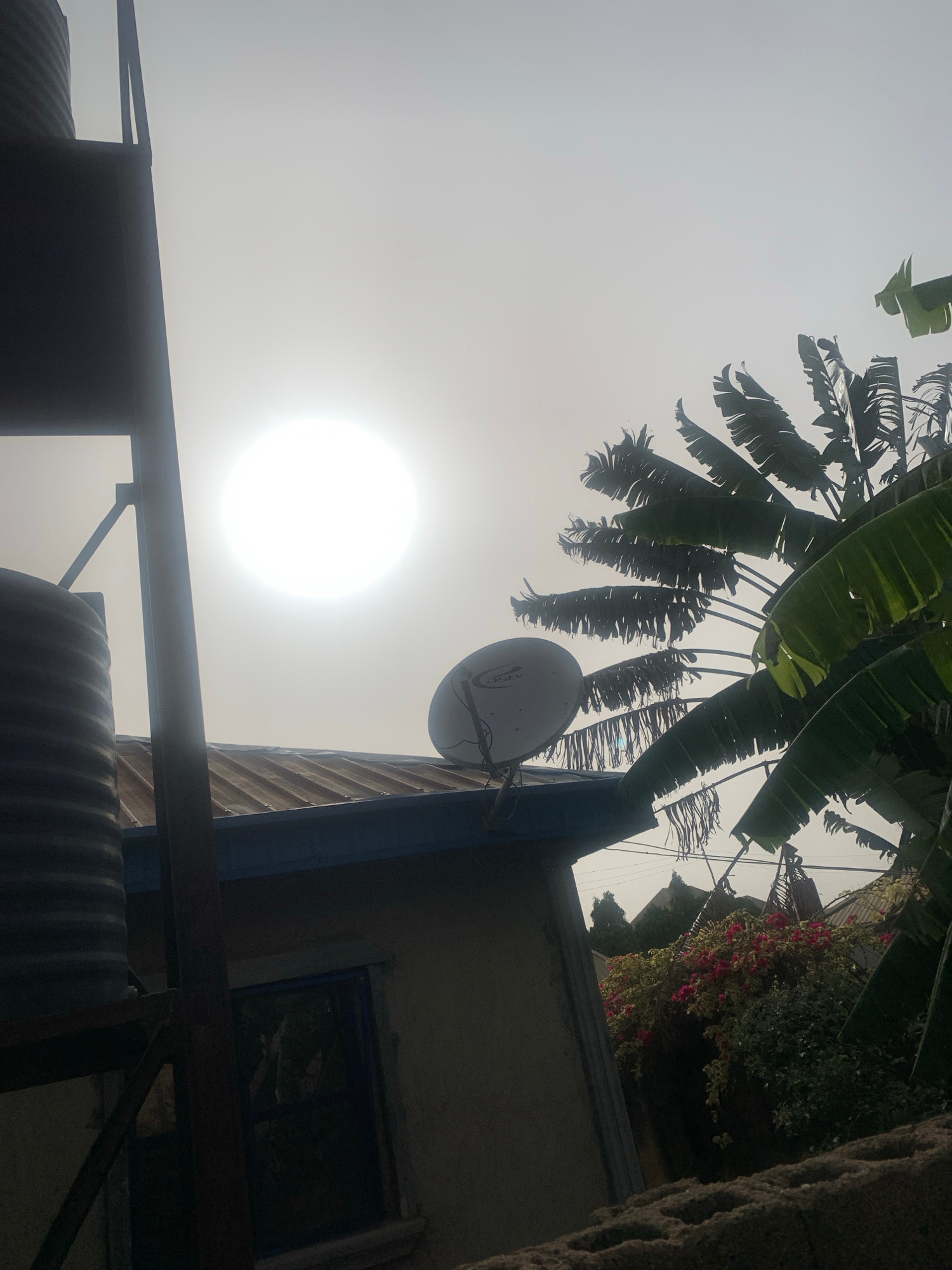The image shows an overcast sky in Barakin Akawo, Nigeria, with the sun as a bright, diffused orb. In the foreground, there's a partially obscured view of a corrugated metal structure with dark beams. A satellite dish is mounted on a blue support structure attached to a building with a window. Overhanging the building is a banana tree and some flowering foliage. The overall scene is viewed from a low angle. | Open Wire