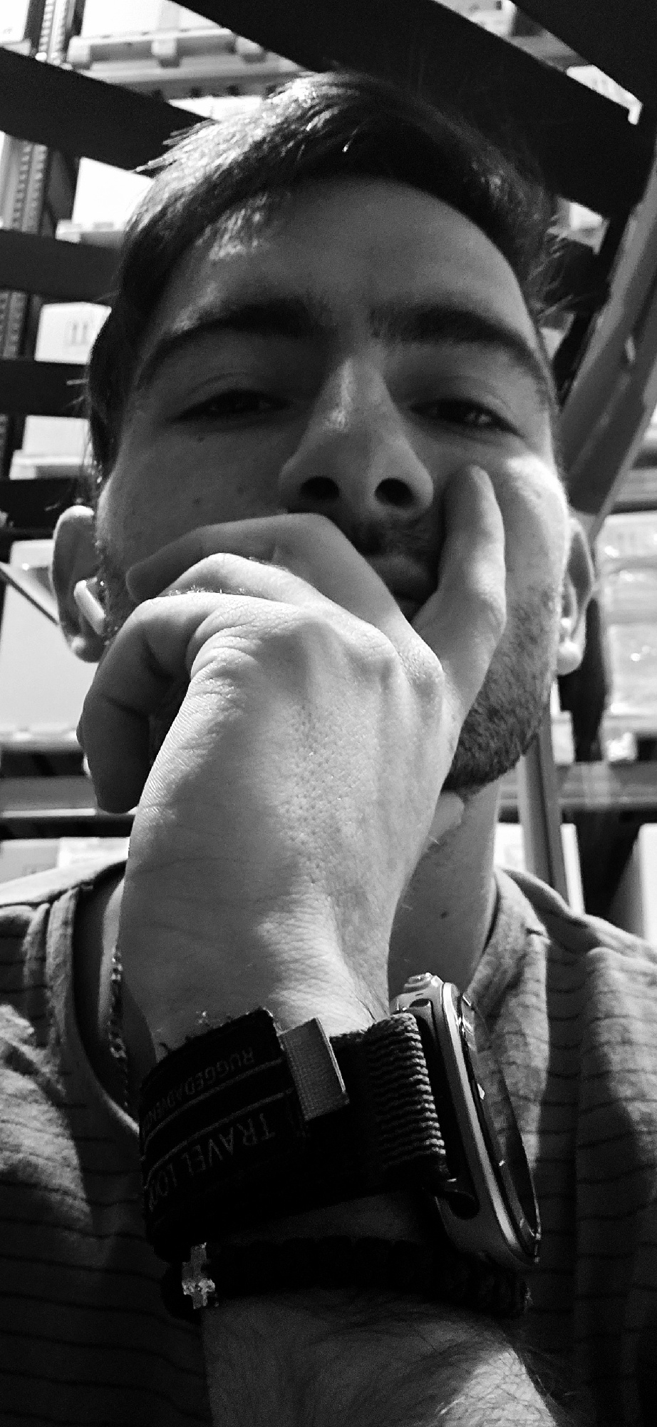 A close-up, monochrome portrait shows a man with dark hair, stubble, and partially closed eyes, positioned from the upper left to the lower right of the frame. He is looking downwards with his face ti…read more