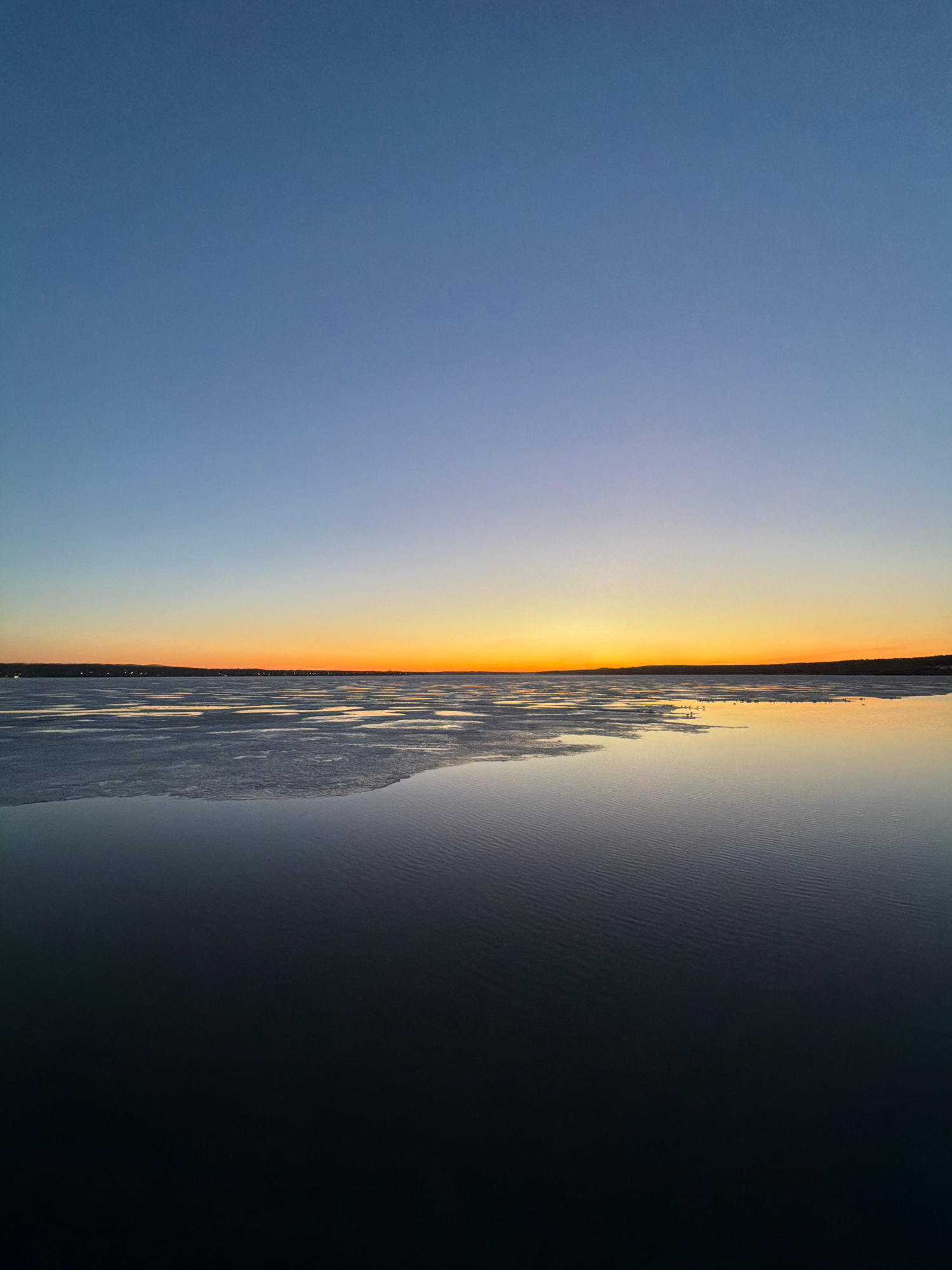 The image shows an aerial, vertically-oriented view of a landscape with distinct sections. On the left, there's a blueish-gray sky transitioning into a bright yellow-orange band at the center, suggestive of a sunset or sunrise. This band is lined with what appears to be a distant skyline, likely a cityscape. To the right of this central band is what appears to be a body of water, dark and textured, potentially a lake or river. The rightmost portion of the image is a deep, dark area, possibly suggesting the water's depths or a shaded area. Given the location as Votkinsk, Russia, the body of water is likely the Votkinsk Reservoir. The skyline may be the city's edge along the reservoir. The image conveys a division between light and dark, sky and water, perhaps representing a transition between day and night. There are no discernible people or objects in the image. | Open Wire