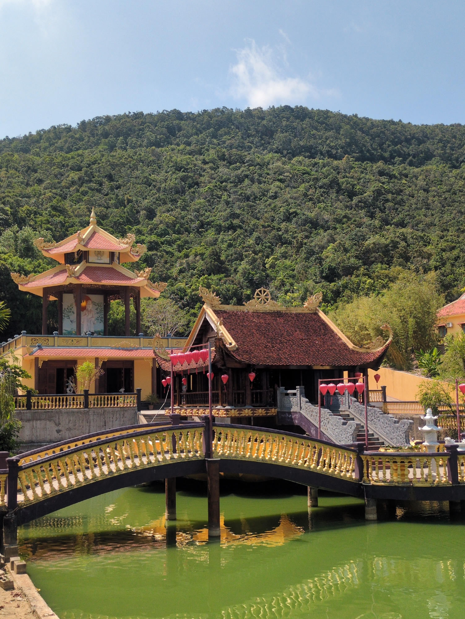 View of Hùng Long Pagoda, Phú Quốc, Vietnam. A hillside covered in trees is to the left. To the right are buildings and a golden arched bridge over a green pond. There is a clear sky.
