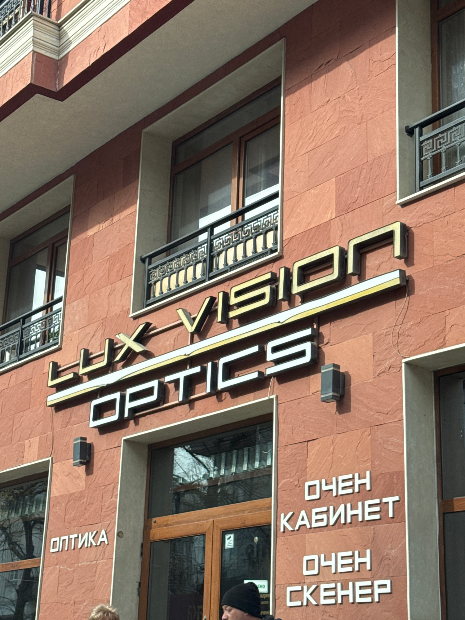The image captures the exterior of an optometry clinic in Varna, Bulgaria. The building is constructed with textured, reddish-brown panels. The signage, rendered in a modern, stylized font, displays "…read more