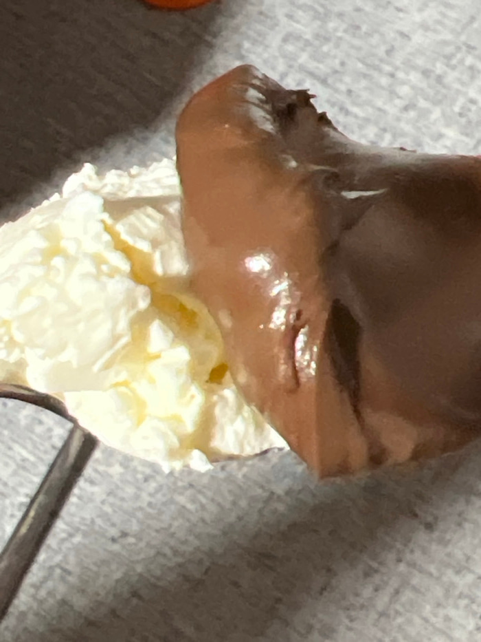 A scoop of white ice cream is heavily topped with a glossy, dark brown, likely chocolate, sauce. The ice cream has a slightly yellow tint. The sauce is thickly applied and covers a significant portion…read more