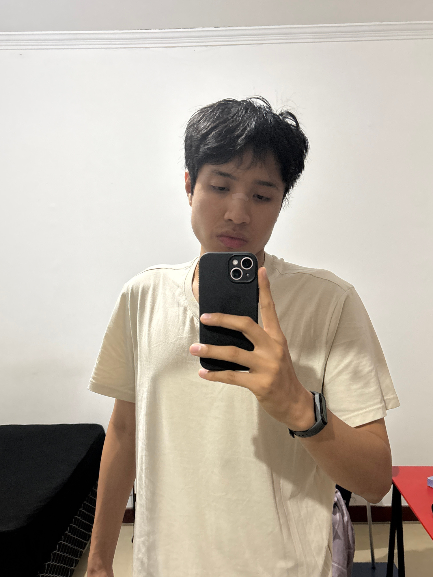 A person is taking a selfie in front of a white wall. The person is wearing a beige t-shirt and a black smart watch. They are holding a black smartphone in their right hand. The background includes a…read more