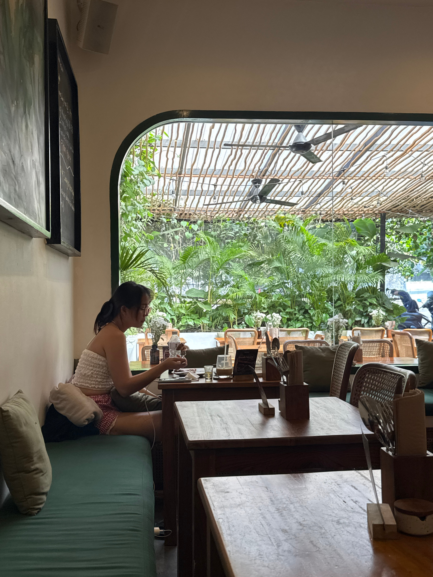 The image shows an interior scene in Kuta Selatan, Indonesia. A woman sits on a green cushion against a wall. In front of her, a wooden table is set with silverware, books, and glasses. Beyond the tab…read more