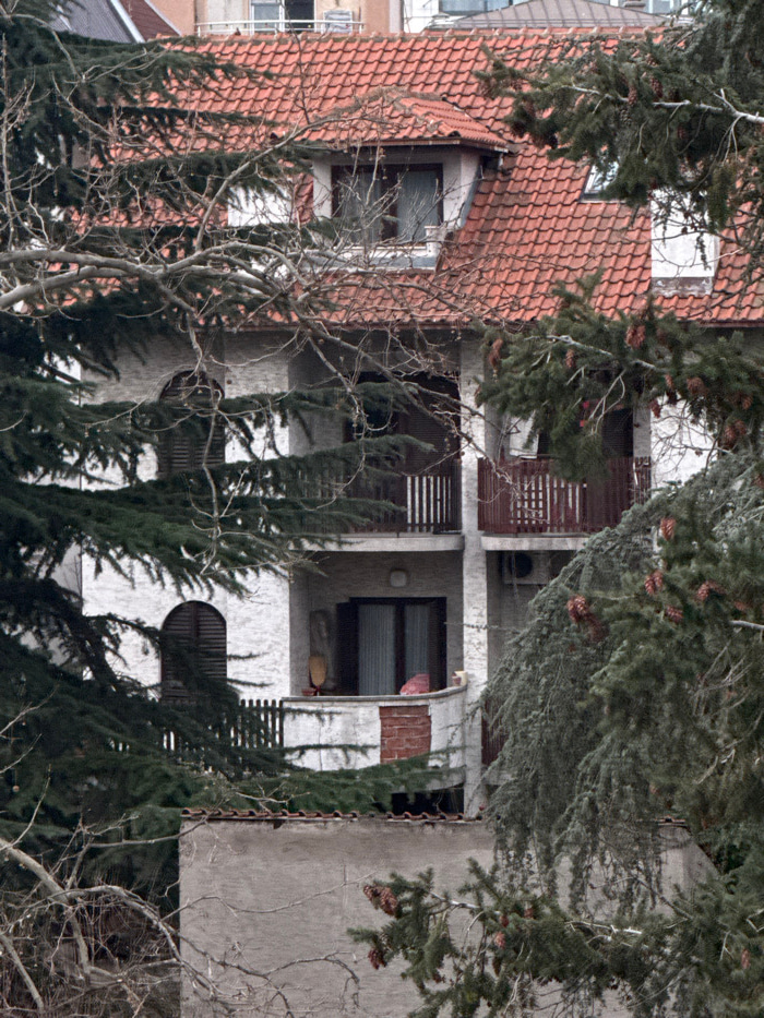 A multi-story building with a red-tiled roof and white balconies is partially obscured by trees and branches. The balconies feature metal railings and dark windows. Some appear to have open slats. A m…read more