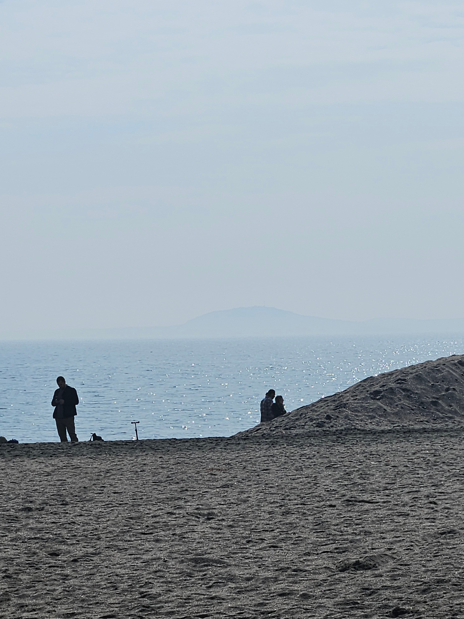 The image presents a landscape scene, likely near the coast. A tall, textured rock formation dominates the right side of the image. To the left of the rock is a body of water that seems to be the sea,…read more