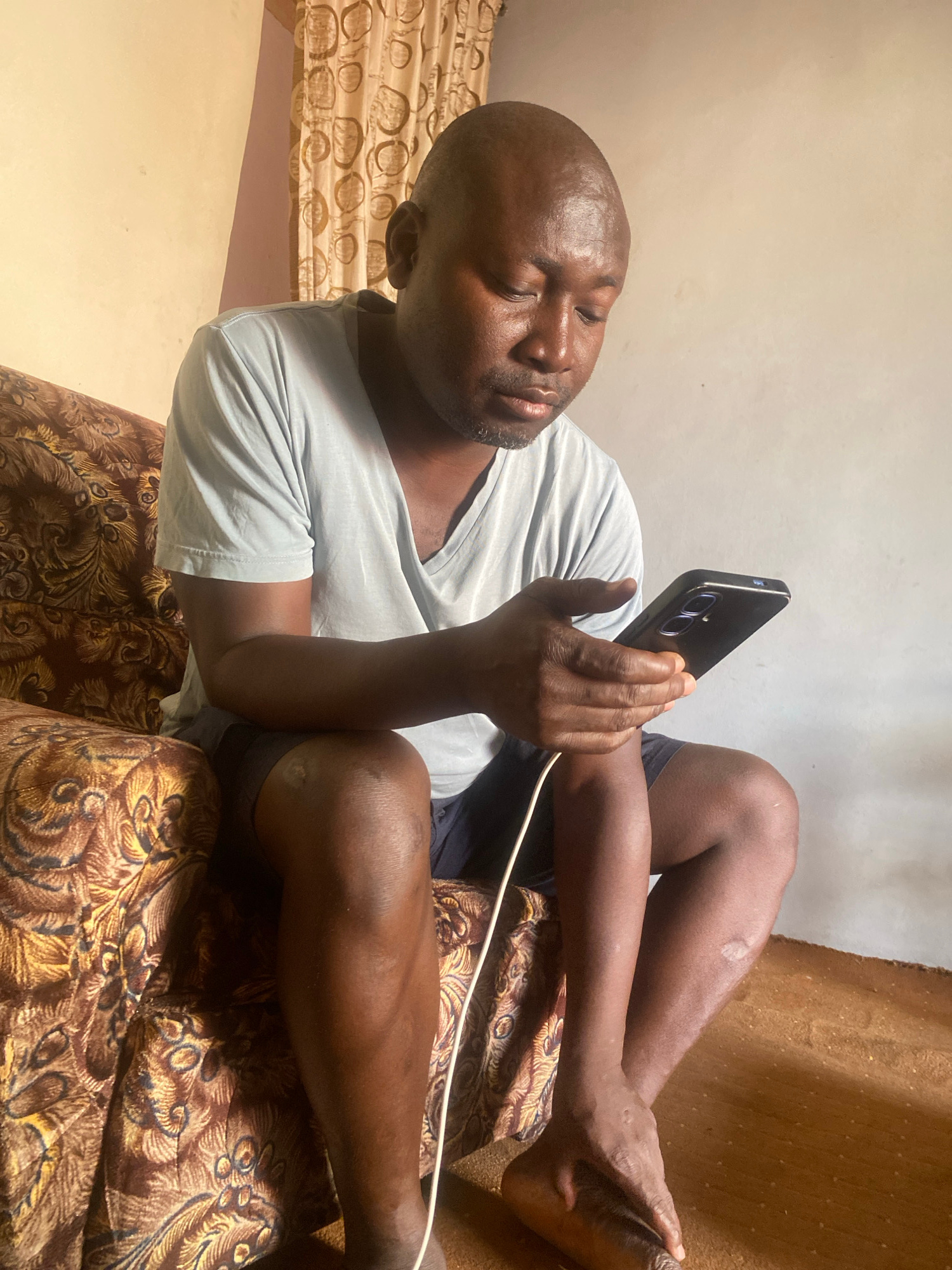 A dark-skinned man is lying on a patterned brown and gold couch in an indoor setting in Sabon Tasha, Nigeria. He is wearing a light gray t-shirt and dark shorts. The man is holding a black smartphone…read more