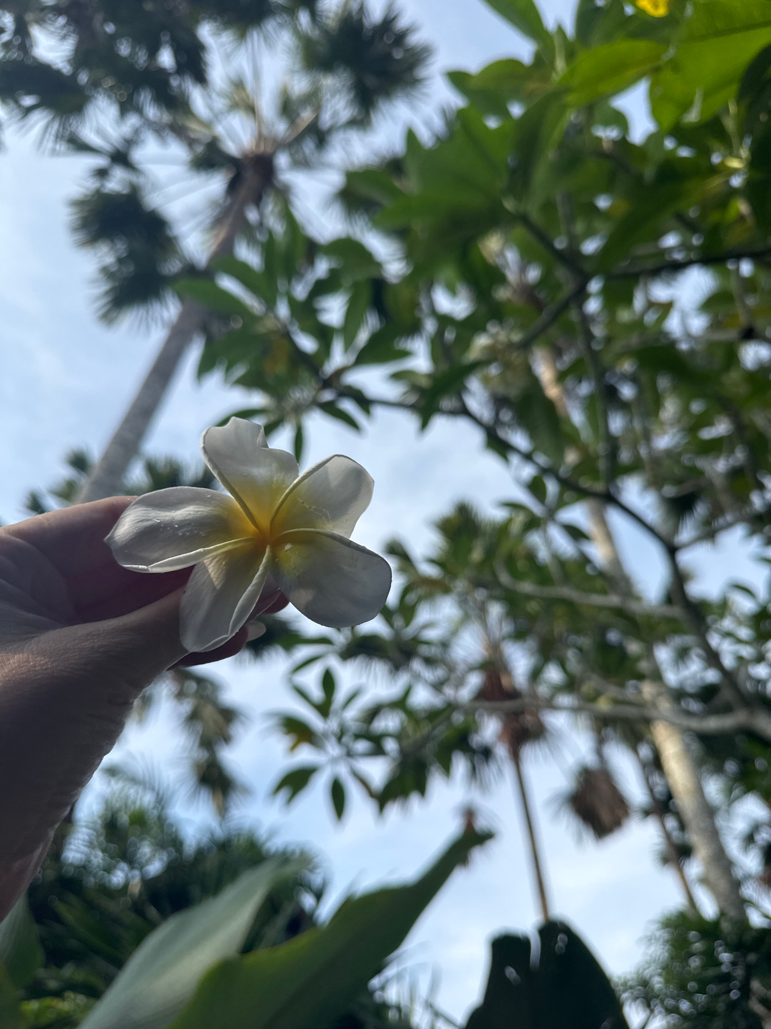 A hand holds a white and yellow plumeria flower in the foreground. The background features a canopy of green leaves and branches against a blue sky with white clouds. The location is implied to be Nus…read more
