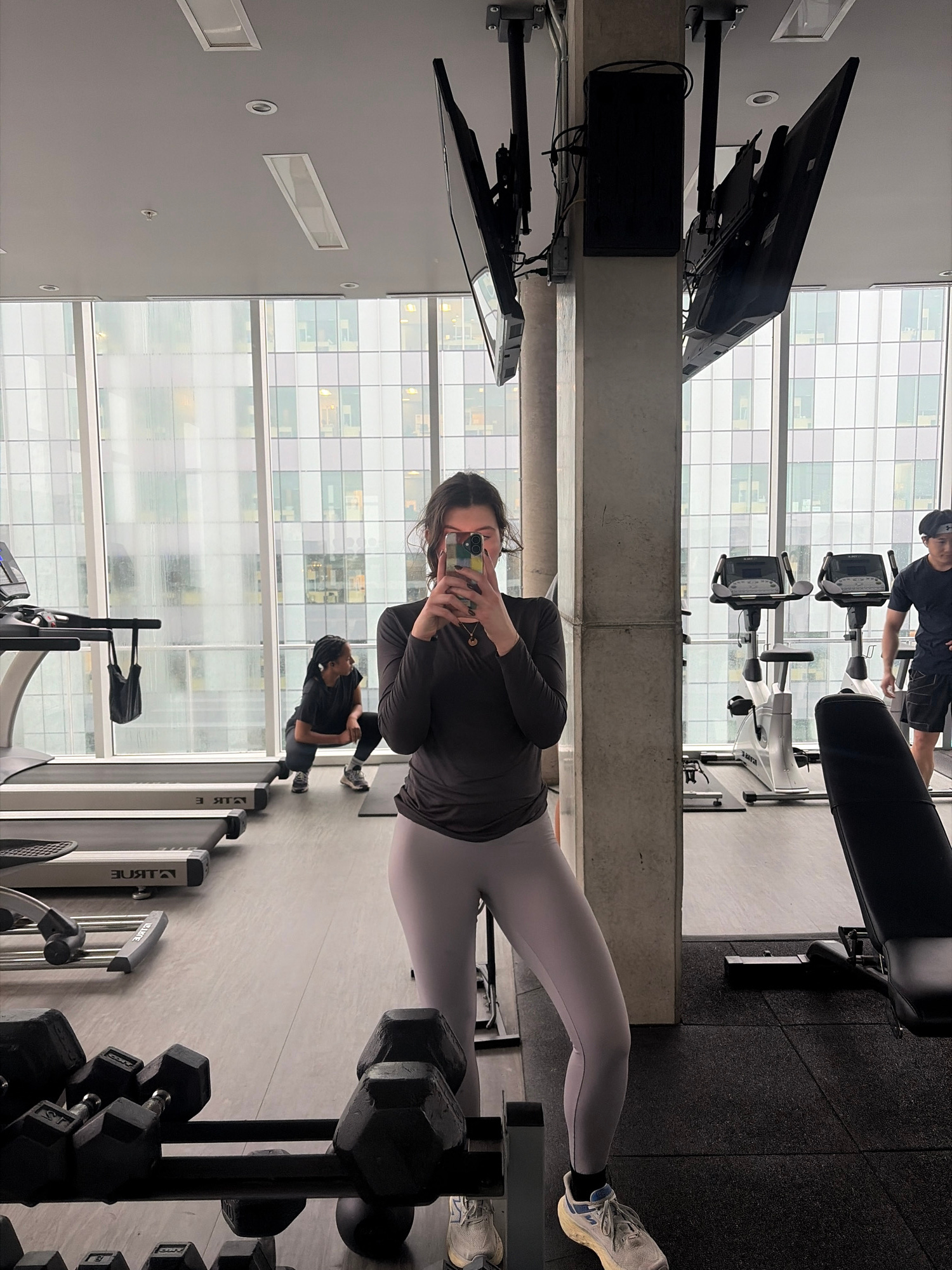 This image captures an interior view of a modern gym or fitness center, primarily featuring a woman taking a mirror selfie. The woman, positioned centrally, wears a dark long-sleeved top, light grey o…read more