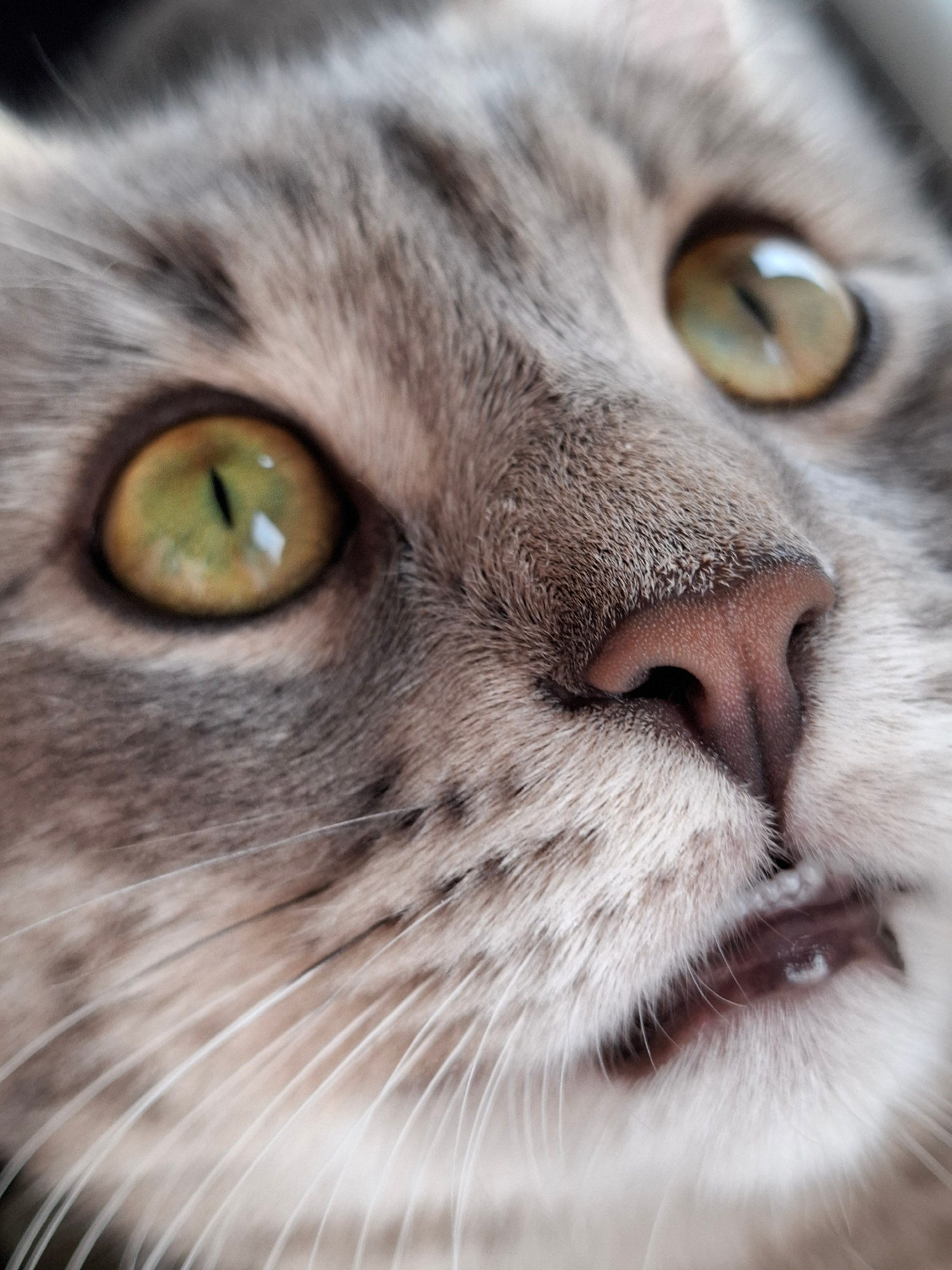 Close-up of a gray tabby cat's face with golden-green eyes, pink nose, and visible teeth. The cat's face is tilted upward towards the camera. Location information (Novi Sad, Serbia) is not discernible…read more
