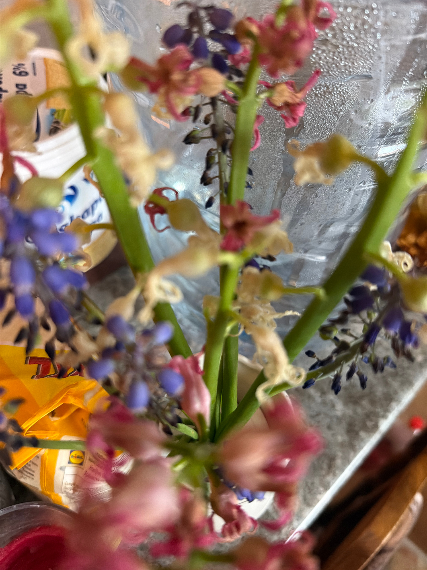 The image depicts a close-up shot of a bouquet of flowers. The bouquet contains hyacinths. The flowers are in a vase with water droplets on it. In the background, there are household objects, includin…read more