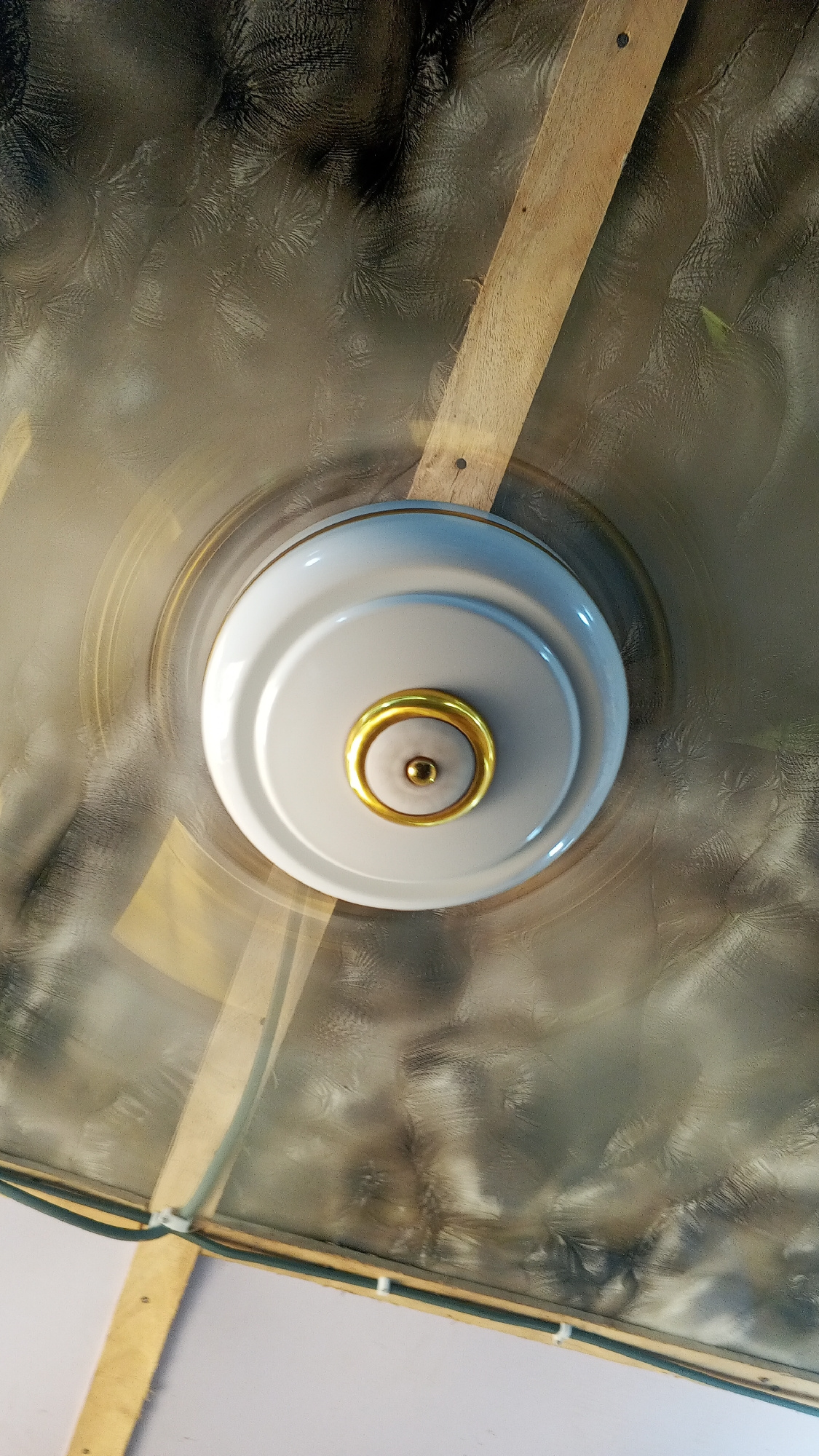 The image presents a direct overhead view of a ceiling fan in motion. The fan's central housing is white with prominent gold trim around its circular base and a central gold knob. Due to the fan's ope…read more