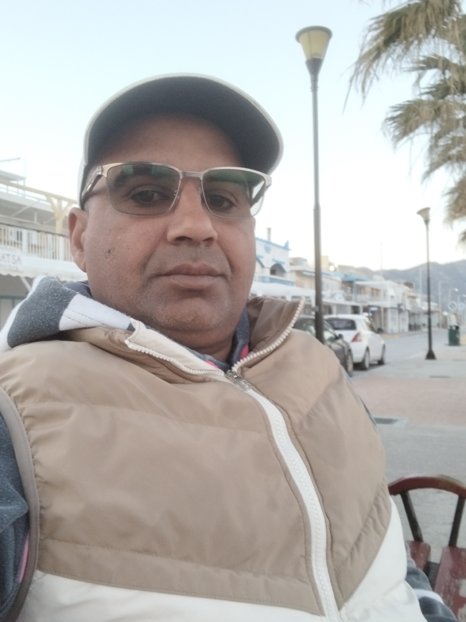 A medium, eye-level shot of a man wearing sunglasses and a sleeveless jacket with a zipper, partially unzipped. The subject's face is prominent, displaying facial details. In the blurred background ar…read more