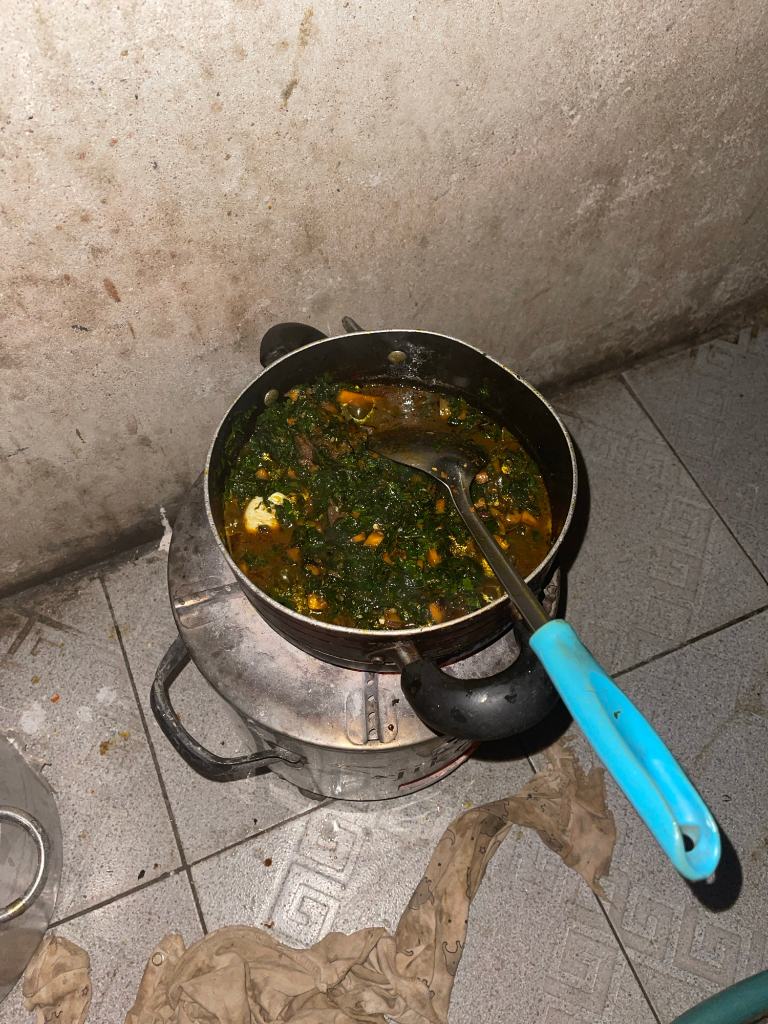 A top-down shot shows a pot of green leafy soup with chunks of food in it, sitting on a stove. A blue-handled spoon is inside the pot. The stove is on a tiled floor, and a dirty cloth is next to it. T…read more