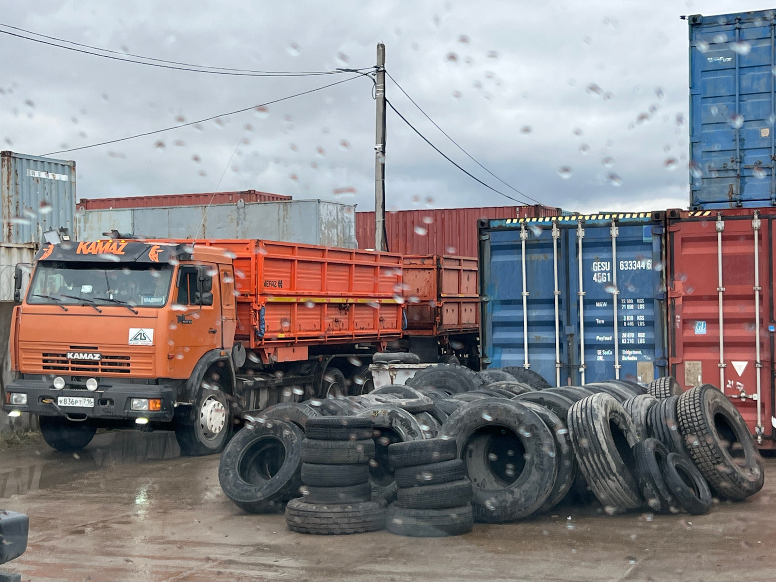 The image shows an orange KAMAZ truck parked in what appears to be a depot or storage area in Naberezhnye Chelny, Russia. The truck has a flatbed and the license plate "K836PT 716". The "KAMAZ" name i…read more