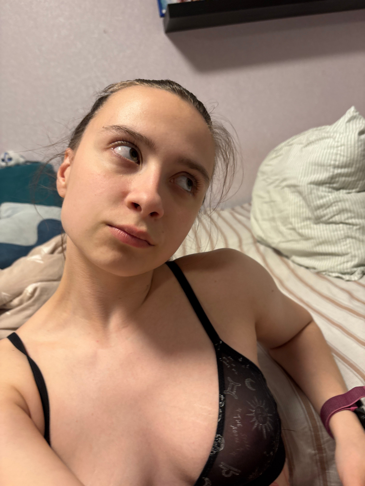 A young woman is shown in a medium shot, lying on her back on striped bedding indoors, likely in a bedroom in Прикамский, Russia. Her head is tilted, and her gaze is directed upwards and slightly to h…read more