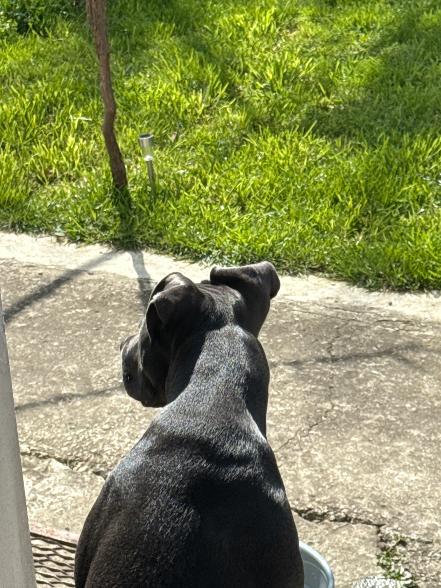 A black dog stands on a concrete surface next to green grass. The scene is outdoors. The precise location in Zornitsa, Bulgaria is not discernible from the image.