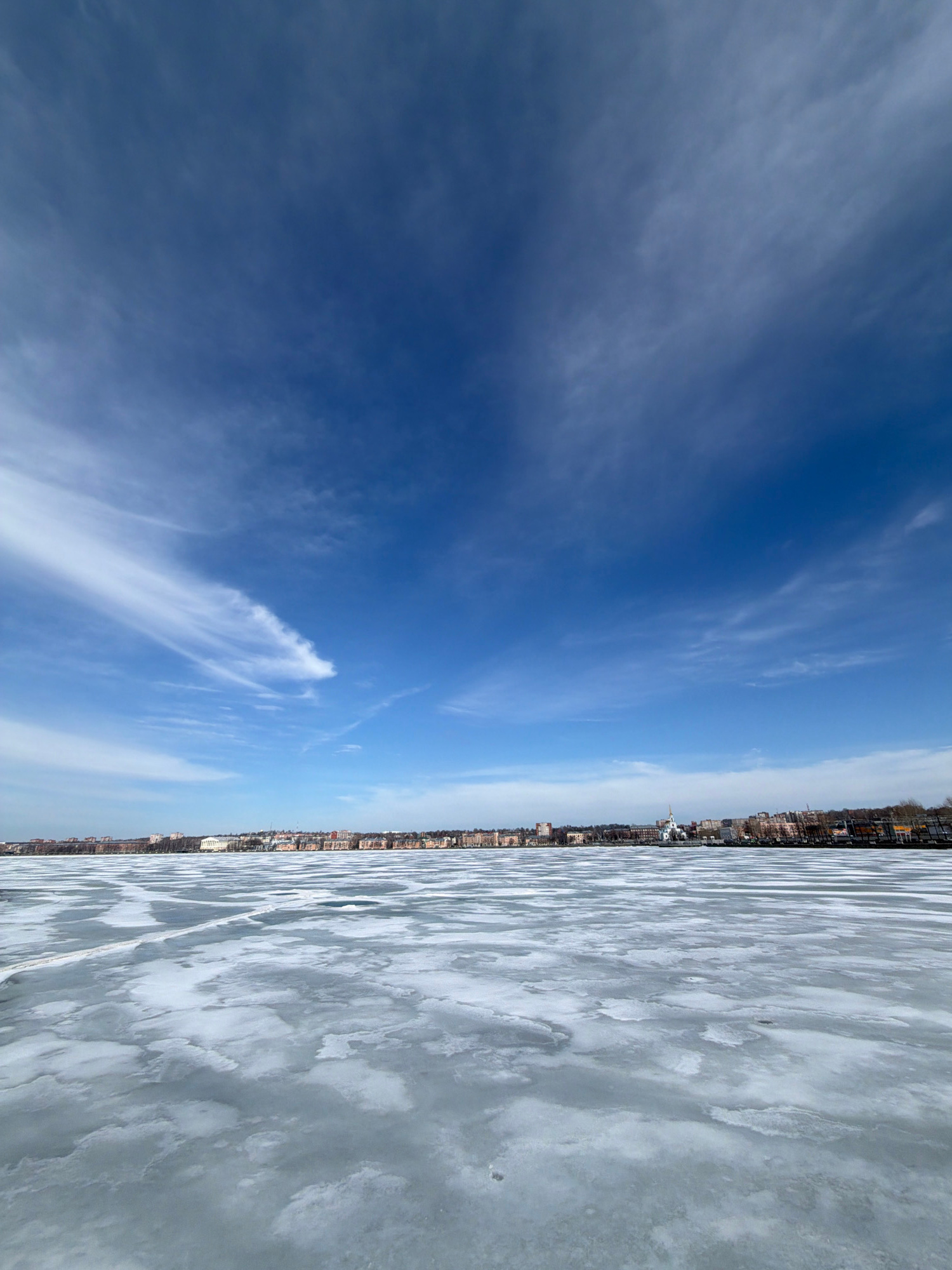 The image shows a winter scene in Votkinsk, Russia. The right side of the image depicts a frozen body of water, possibly the Votkinsk Reservoir, with a cracked ice surface. On the horizon is the citys…read more