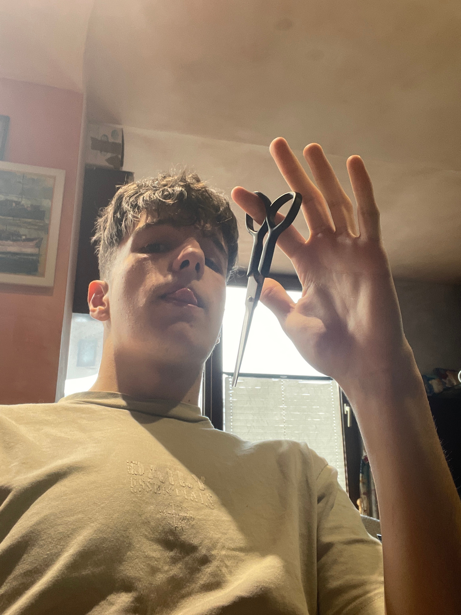 A man is holding a pair of scissors to his head. The man is wearing a light-colored t-shirt. A hand is hovering above the scissors. There is a window in the background. A painting is visible on the wa…read more