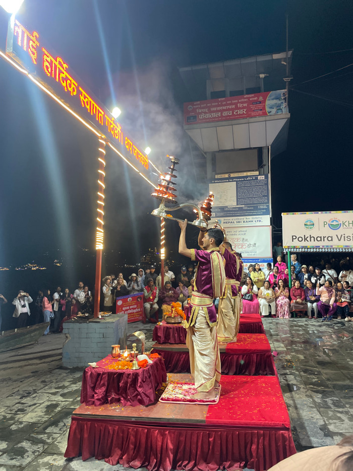 At night, an outdoor Hindu Aarti ceremony unfolds on the paved bank of Fewa Lake in Pokhara, Nepal. Three male performers, dressed in traditional maroon and gold attire with cream dhotis, stand barefo…read more