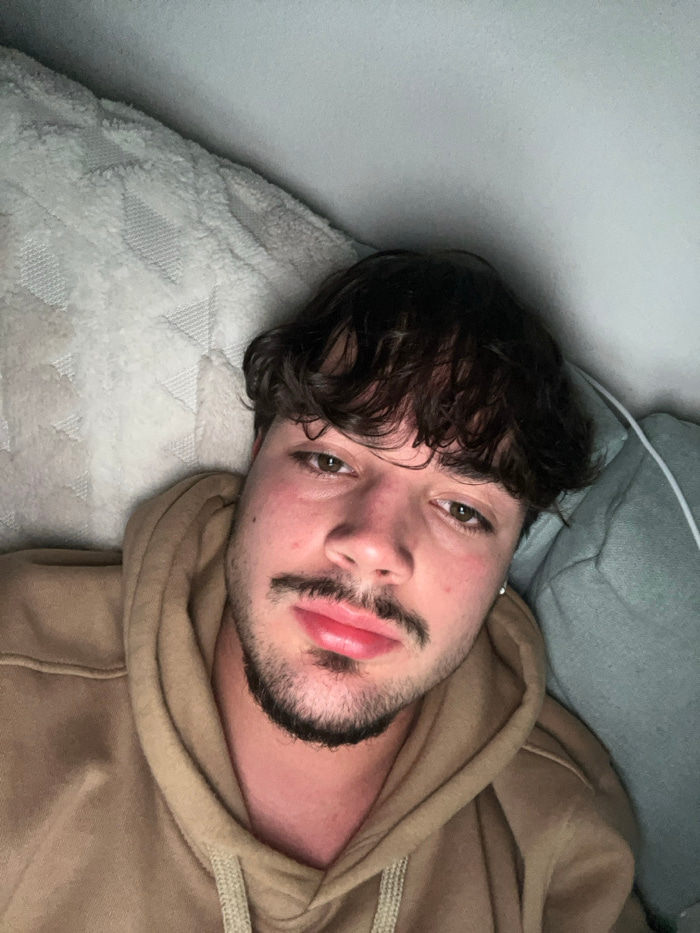A close-up, slightly tilted image features a young man lying down indoors, looking towards the camera. He has dark, curly hair that frames his face, and a short beard and mustache. He is wearing a lig…read more