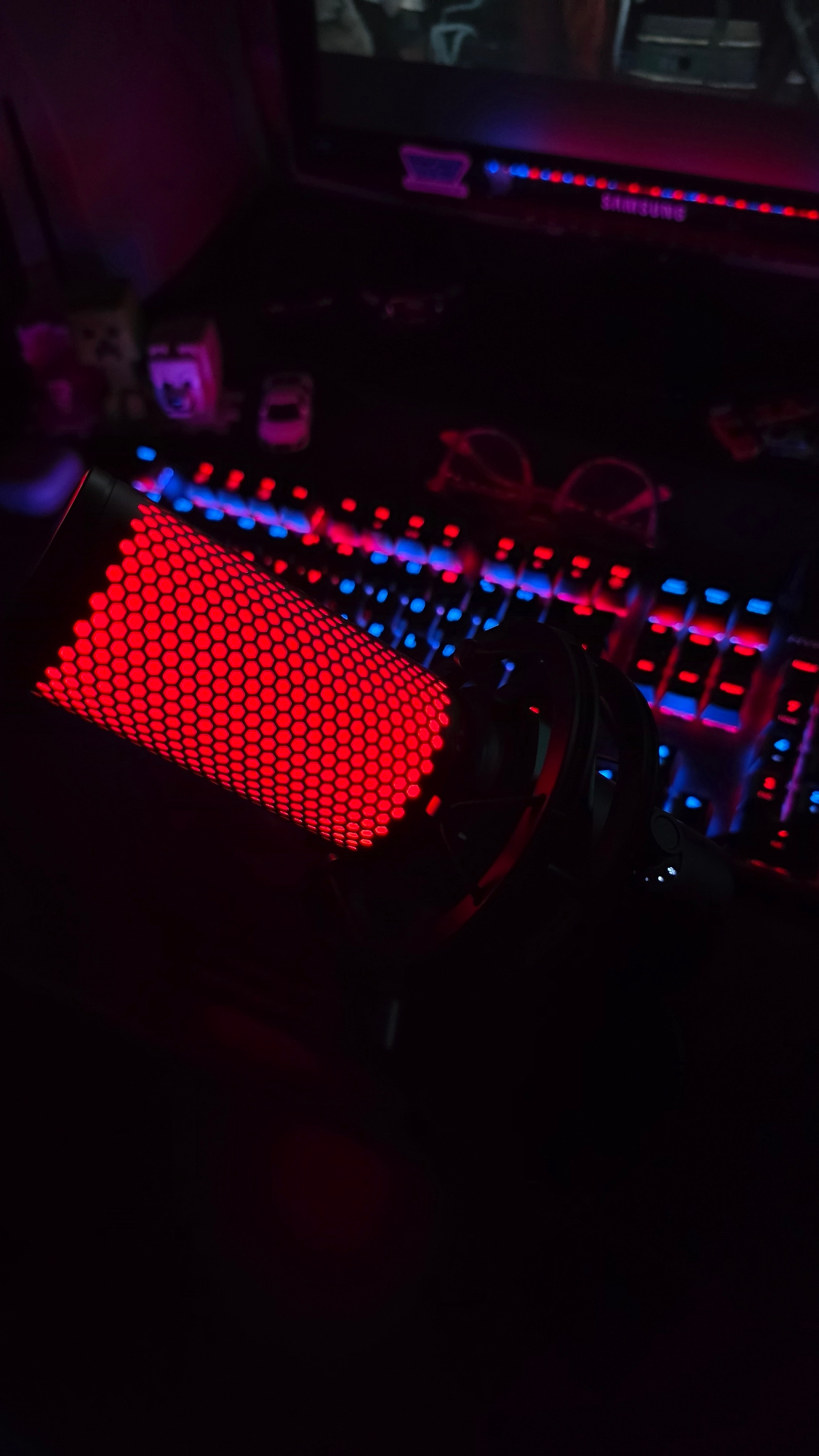 The image captures a dark, indoor scene, likely a gaming or streaming setup in Varna, Bulgaria. The central subject is a microphone, prominently displayed in the foreground, illuminated with a vibrant…read more