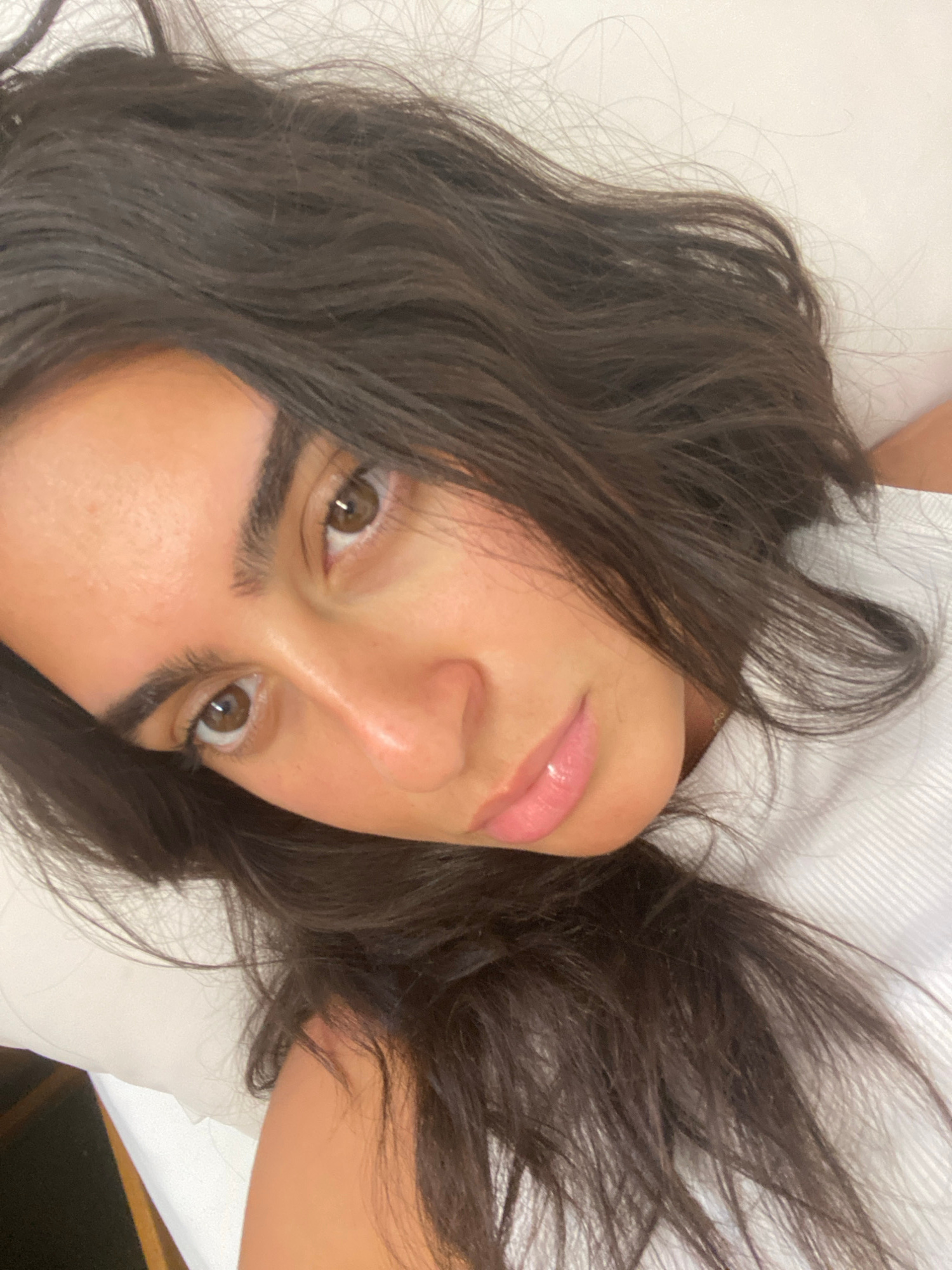 A close-up, angled portrait of a woman lying on what appears to be a bed. The woman has dark hair and brown eyes. Her lips are glossy. She is looking up at the camera. The background is a white pillow…read more