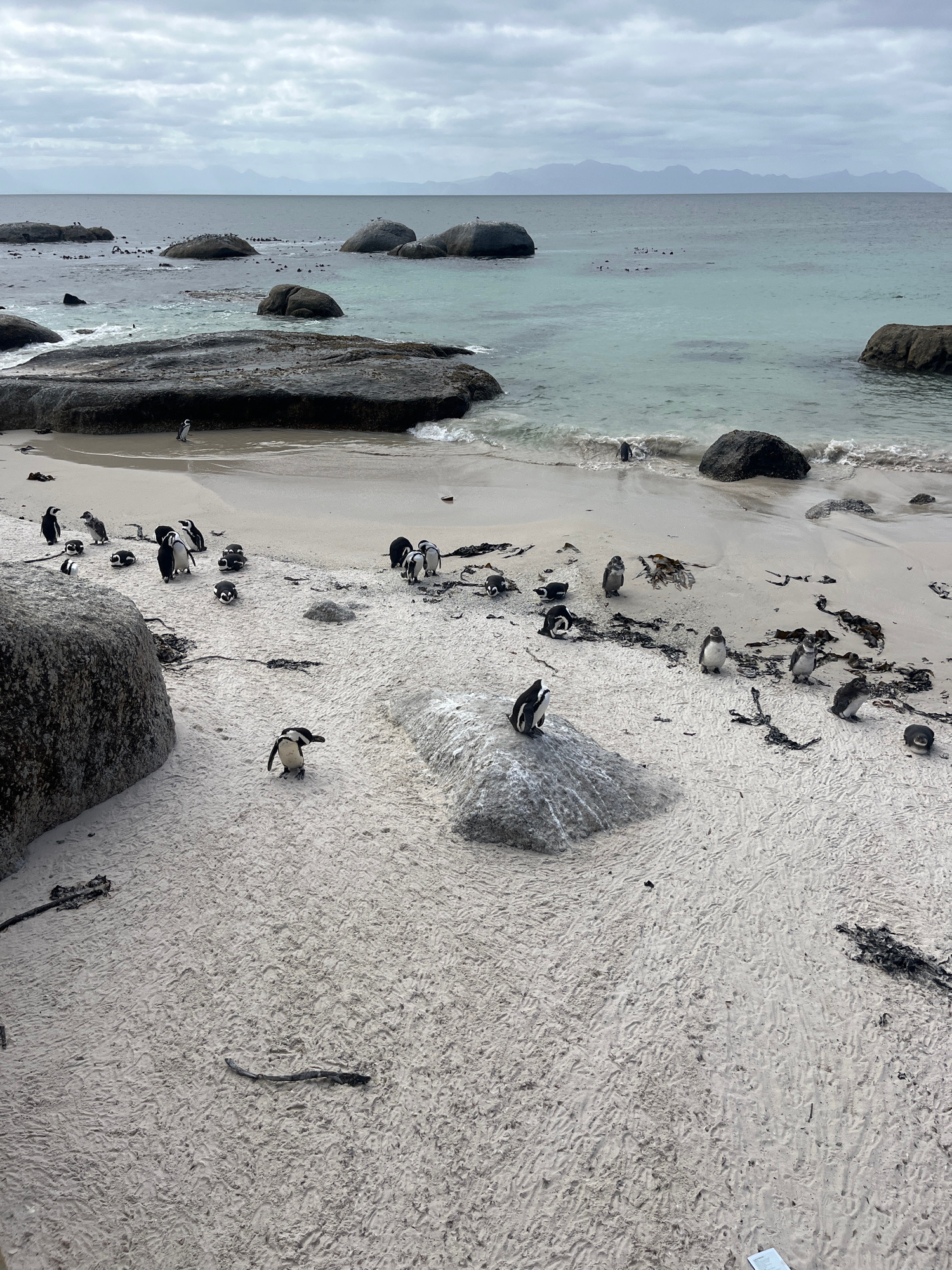 This image captures a wide-angle view of a sandy beach and ocean, located in Simon's Town, South Africa. The sky is uniformly overcast and grey, with distant, hazy mountains visible on the horizon. Th…read more