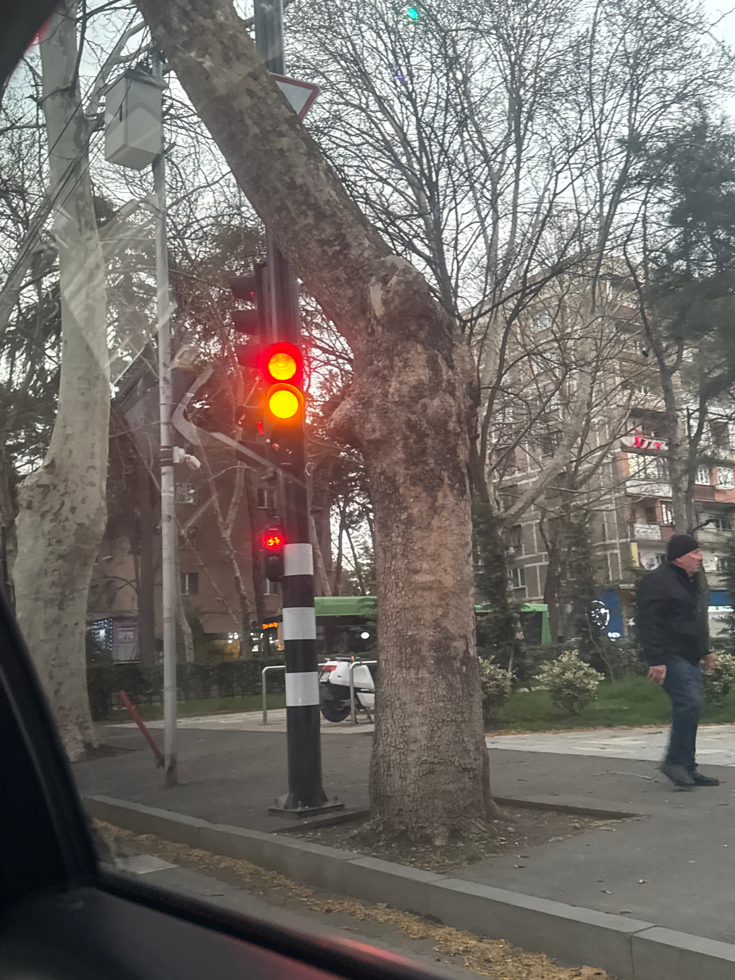 The image displays an urban street scene in Tbilisi, Georgia, captured from inside a vehicle. A prominent black pole with white stripes near its base supports a traffic signal displaying two illuminated red lights stacked vertically, along with a smaller red 'do not walk' pedestrian signal below. A small red rectangular sign with the numeral '1' is affixed to this pole. To the immediate right of the traffic signal pole stands a large deciduous tree with rough bark and bare branches, partially obscuring a white triangular yield sign positioned higher up. Another utility pole with a light-colored rectangular utility box attached and visible wiring is situated to the left of the main traffic signal. The background features several other deciduous trees with bare branches, behind which multi-story buildings are visible; one building exhibits balconies with red objects draped over a railing. On the right side of the image, a male individual wearing a dark jacket, blue jeans, and a black beanie is walking rightward on a paved sidewalk. A white scooter is partially visible, parked behind the traffic light pole. Further right, a green structure, possibly a bus stop or kiosk, is present behind the walking individual. The foreground includes the dark frame of a vehicle's interior and a red reflection at the bottom. The ground consists of paved sidewalk, a curb, and exposed soil around the tree bases. The sky appears overcast. | Open Wire