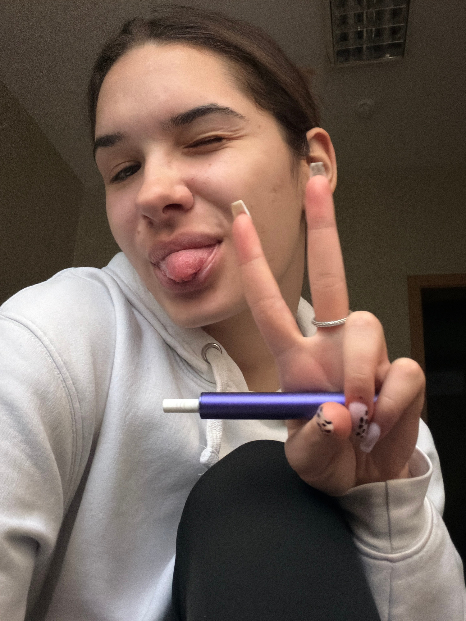 A close-up, rotated selfie features a young individual, likely female, captured indoors. The subject has dark brown hair, pronounced eyebrows, and fair skin, and is shown mid-expression with one eye winking and their tongue playfully sticking out. They are wearing a white hooded sweatshirt with visible drawstrings and stitching details. One hand is prominently displayed, making a "V" sign with the index and middle fingers extended. The fingernails have a light, possibly pink or nude, base coat with dark, speckled patterns, reminiscent of an animal print like cow print. A silver-colored, twisted or braided ring is worn on the index finger. Between the index and middle fingers, the person holds a slender, purple cylindrical device with a white tip, strongly resembling a vape pen. The background is dimly lit and indistinct, suggesting an indoor setting with low ambient light. In the upper left background, a rectangular metallic vent or grate is visible against a dark wall. Hints of other dark furniture or objects are present in the deeper background. The overall mood conveyed is casual and playful. There is no visible text within the image. The context places this scene in Sofia, Bulgaria. | Open Wire