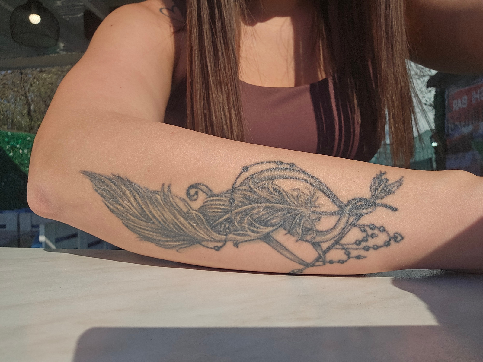 A woman's forearm rests on a white, possibly sunlit, table. The arm has a large, black and gray tattoo featuring a feather, an infinity symbol, and beads. The woman is wearing a tan top. Her brown hai…read more