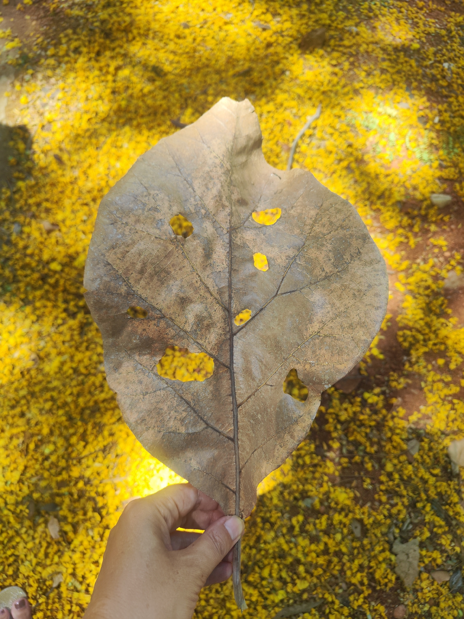 A close-up shot shows a large, brown, dry leaf with several holes, held by a fair-skinned hand. The leaf is centrally positioned, with its stem extending towards the upper right corner of the frame. T…read more