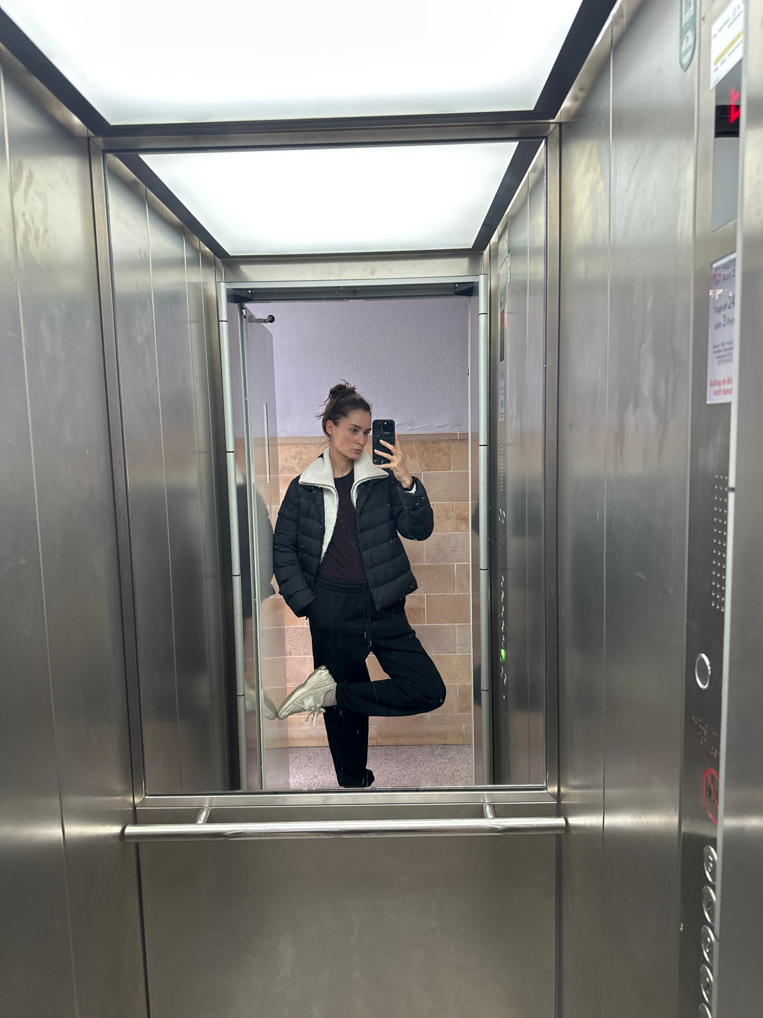 A person in an elevator in Kiel, Germany, is taking a selfie. The elevator's interior consists of metallic walls and a bright, rectangular light panel on the left. The person, wearing a black puffer j…read more