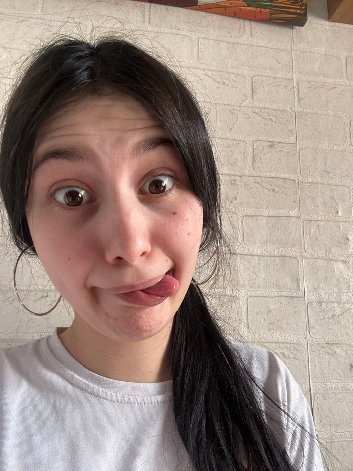 The image displays a young female, situated indoors within the city of Фоки, Russia. She is centrally positioned, looking directly into the camera with wide-open eyes and raised eyebrows. Her dark, lo…read more