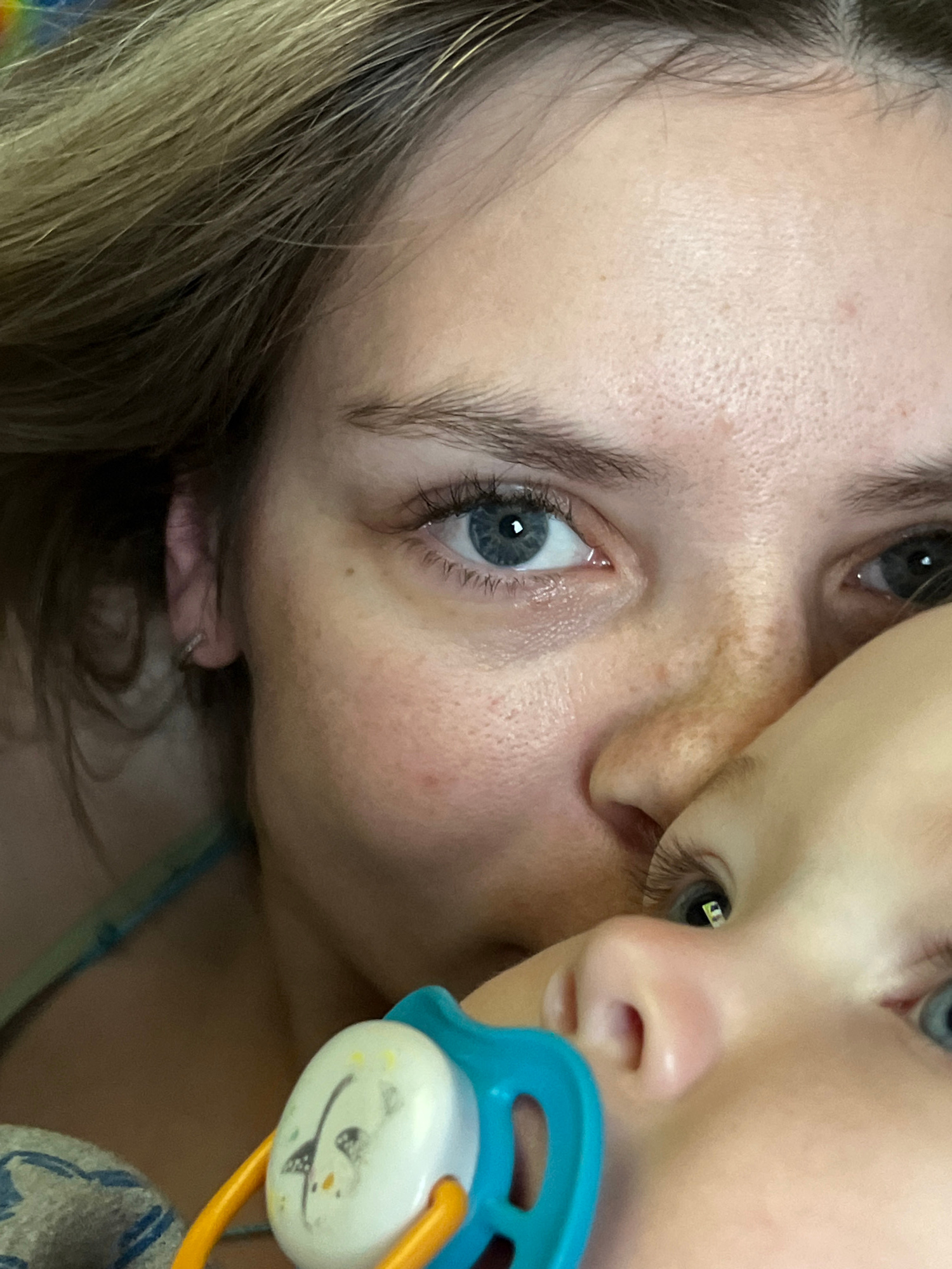 The image shows a close-up of a woman and a child. The woman has blue eyes, light skin, and light-colored hair visible in the corner of the frame. The child is positioned close to the woman, with part…read more