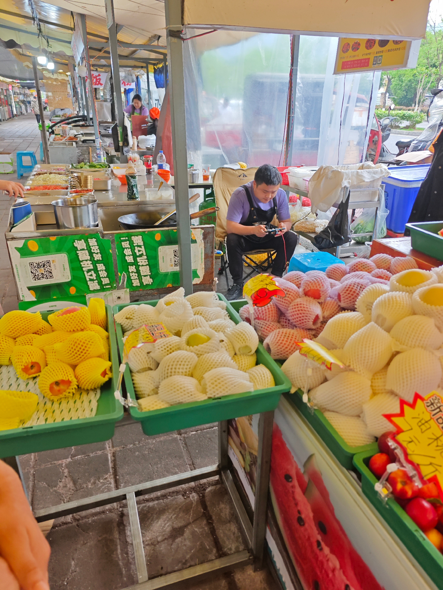 The image captures a scene at a fruit stall in Shapingba District, China. In the foreground, three green trays display various fruits individually wrapped in protective netting. The tray on the left h…read more