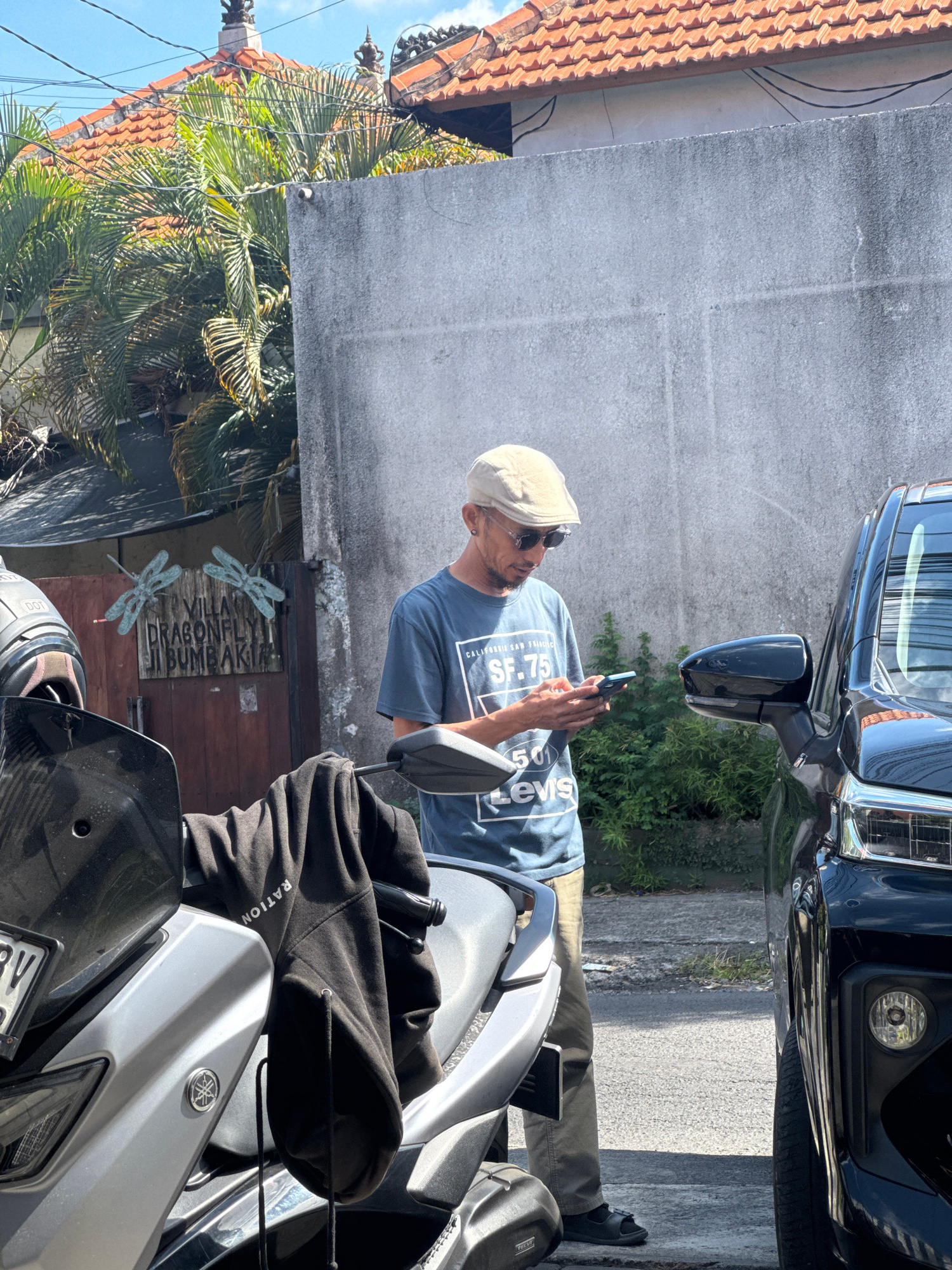 The image captures an outdoor scene in bright daylight, likely in North Kuta, Indonesia. A man, appearing to be in his 30s or 40s, stands next to a silver and black scooter, intently looking down at a…read more