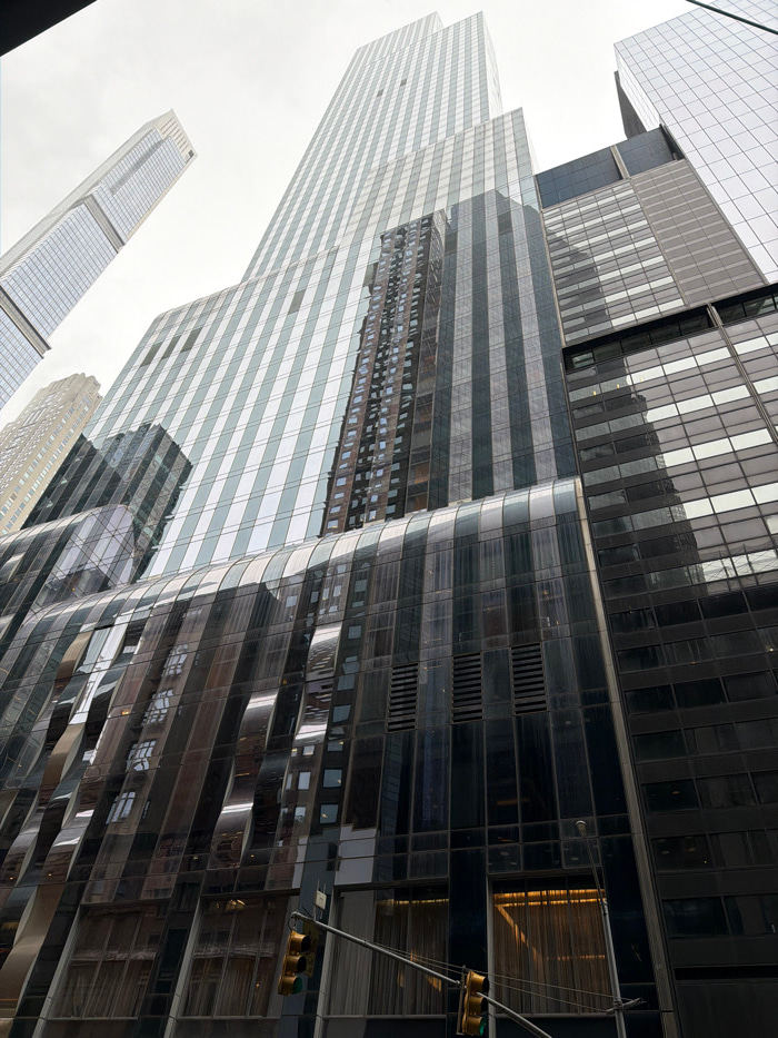The image displays a low-angle, upward view of multiple skyscrapers in Midtown Manhattan, New York City, United States of America, under an overcast sky. The central focus is on two prominent high-ri…read more