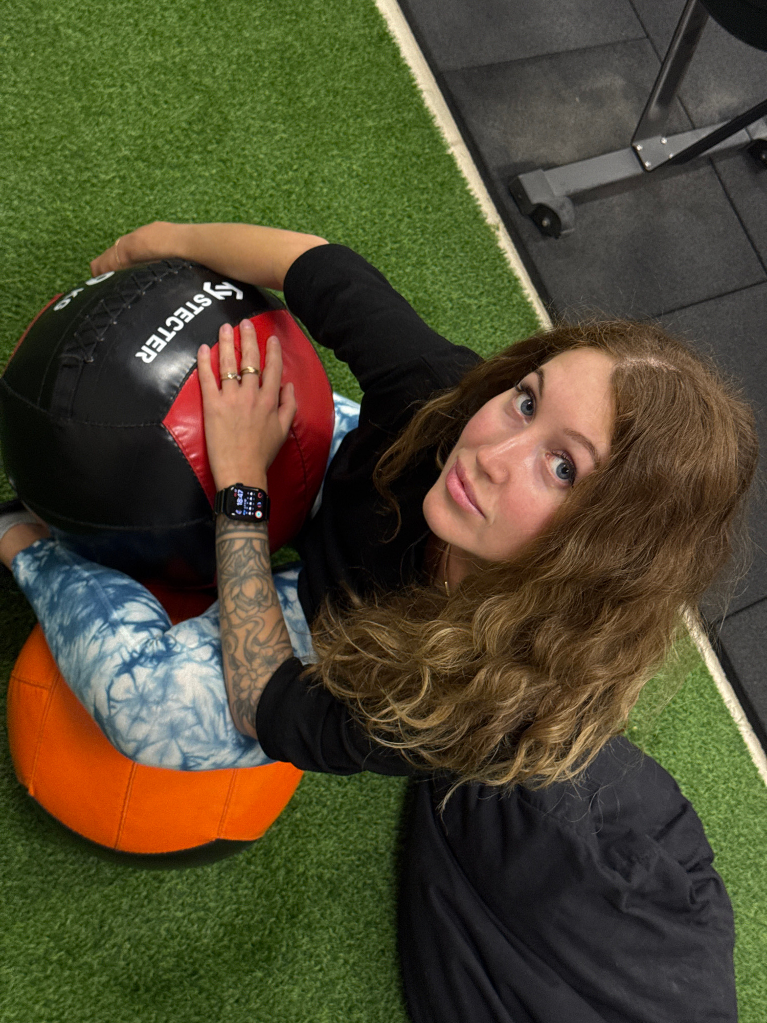 An overhead shot captures a young woman posing in an indoor gym or fitness facility in Chaikovsky, Russia. She has long, wavy brown hair and blue eyes, looking directly at the camera with a calm, inqu…read more