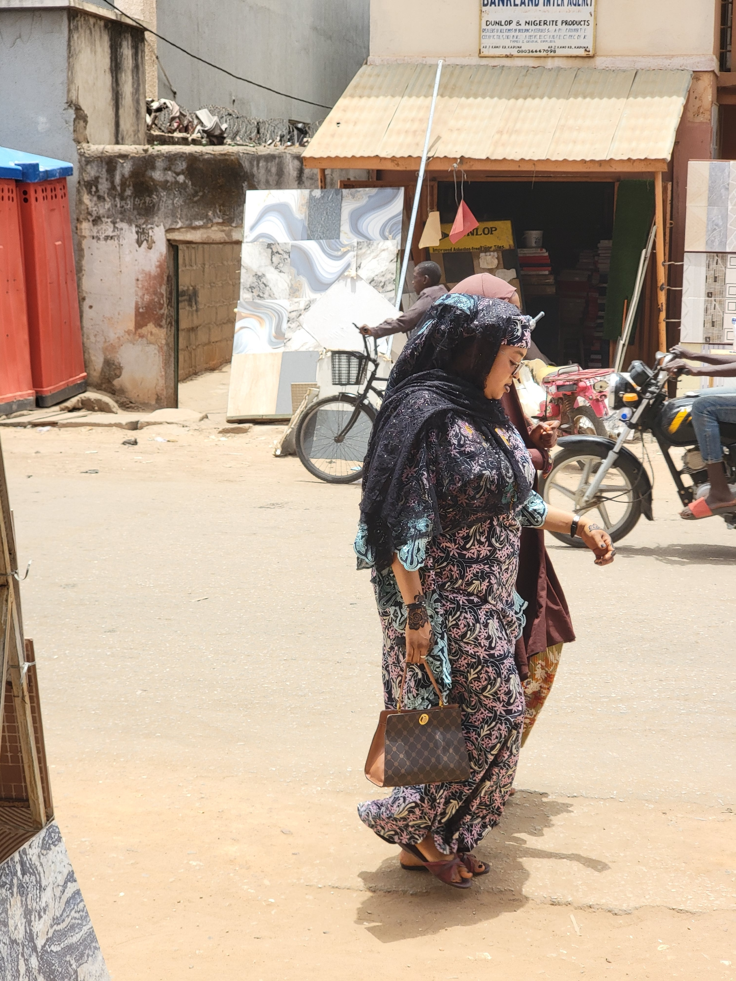 The image captures a street scene in what appears to be Maiburiji, Nigeria. A woman wearing a patterned dress and a black headscarf is walking on the sidewalk. She carries a brown purse. Next to her,…read more